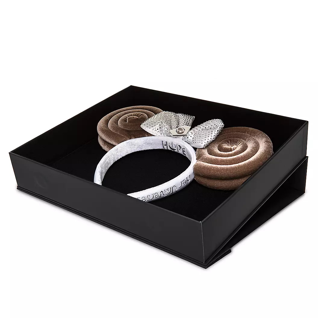 The flexible headband is covered in faux leather band on the top with Her Universe logo embroidered on the side, while the underside has non-slip lining which is embroidered ”Hope” using the Rebel Alliance symbol as the ”o”. The soft plush ‘ears’ are inspired by Leia’s hair, and are accented with a gem-encrusted white satin bow.