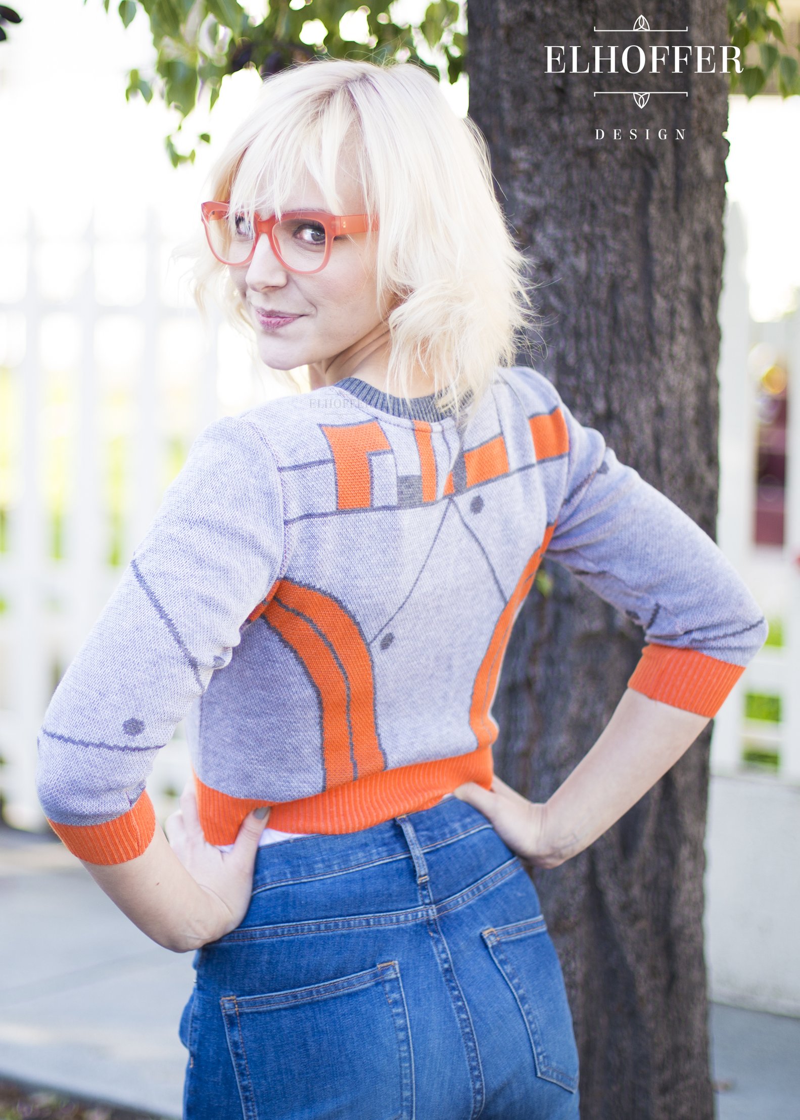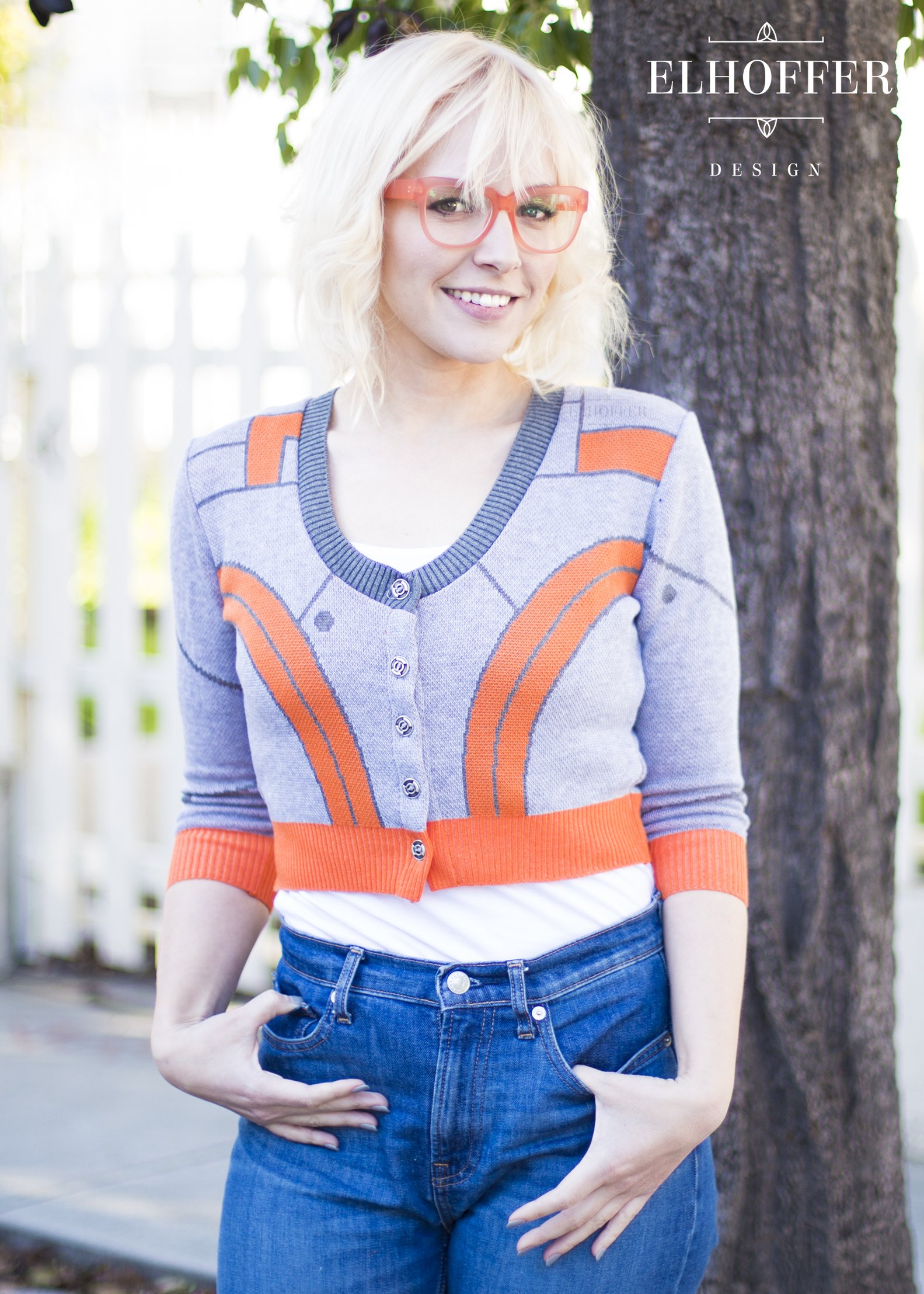 This cute new Star Wars BB-8 inspired cropped cardigan is now available for pre-order from Elhoffer Design. Part of the Galactic Apparel range of Star Wars inspired fashion, the ‘Galactic Baby Bot’ cardigan features a BB-8 inspired design of grey and orange details. Made from 100% acrylic yarn, the cardigan has 3/4 length sleeves, a low neckline and a button-up front.