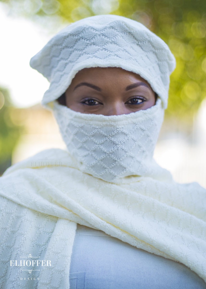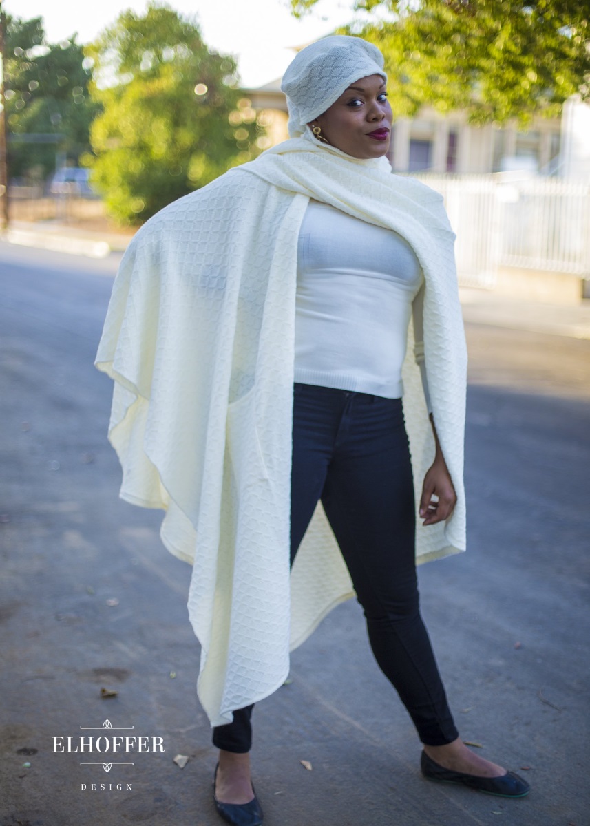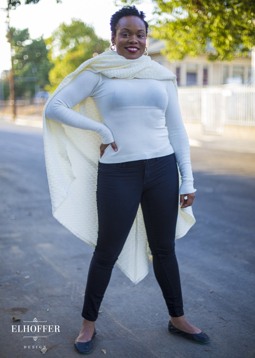 Get ready to celebrate – Elhoffer Design has just released a new mini-collection of Padme’ Amidala inspired apparel! Following on from her amazing Padme’ knitwear collection last year, the new range is inspired by Padme’s white battle outfit that she wears on Tatooine and Geonosis in Attack Of The Clones. The designs include a white pullover sweater, an ivory cape style cardigan, and separate ivory hood (Padme’s costume included a hood, which was seen in behind the scenes footage but not in the final cut).