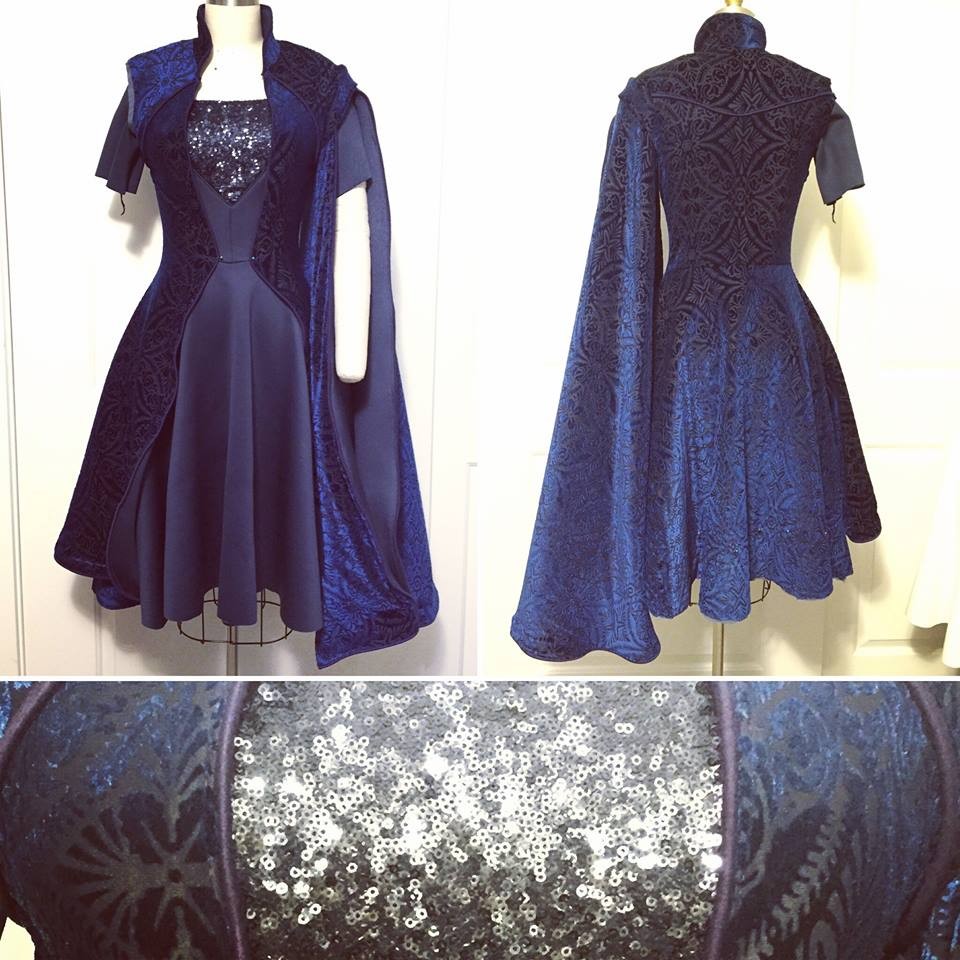 The coat is made from a burnout stretch velvet and a navy and grey double scuba, with the navy as the interior color, and a purple ponte as the piping. The underdress is made from the same double scuba as well as a stretch sequin fabric for the chest detail.