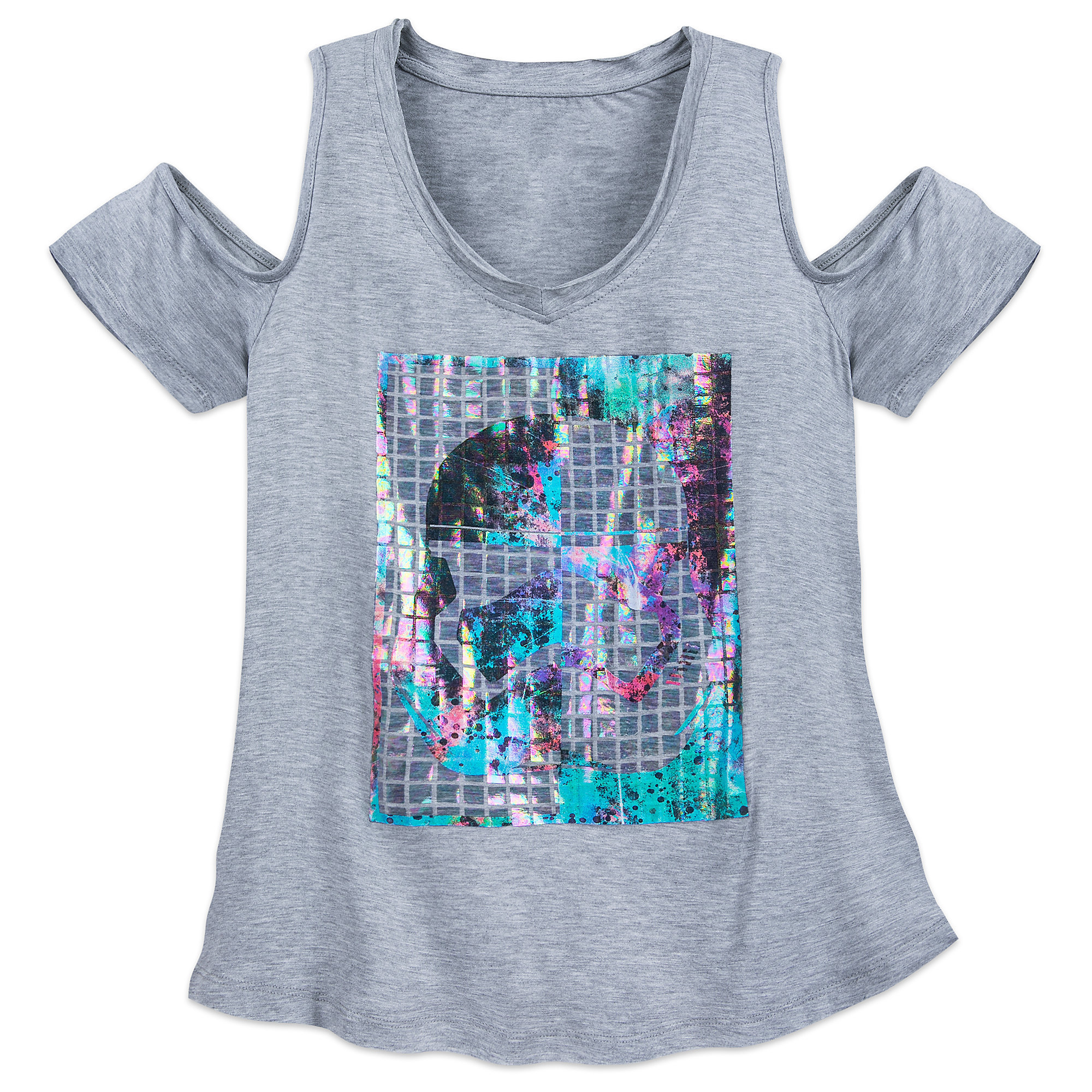 This women’s Star Wars First Order Stormtrooper cold shoulder top is now available at Shop Disney. The heather grey top features cold shoulder style cut-outs on the shoulders, and a front design of a First Order Stormtrooper helmet made from iridescent mosaic tiles!
