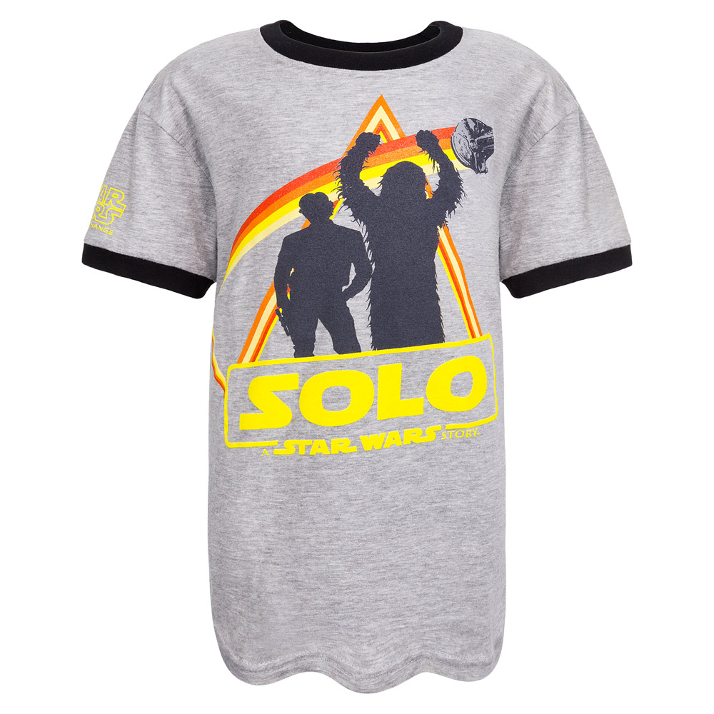 The Star Wars Show and StarWars.com have revealed new Force For Change t-shirts for the upcoming Solo: A Star Wars Story film. The range includes 3 three adult/unisex t-shirt designs, each featuring the Solo film logo. Two of the designs also feature artwork including the silhouettes of Han Solo and Chewbacca, with the Millennium Falcon flying overhead.