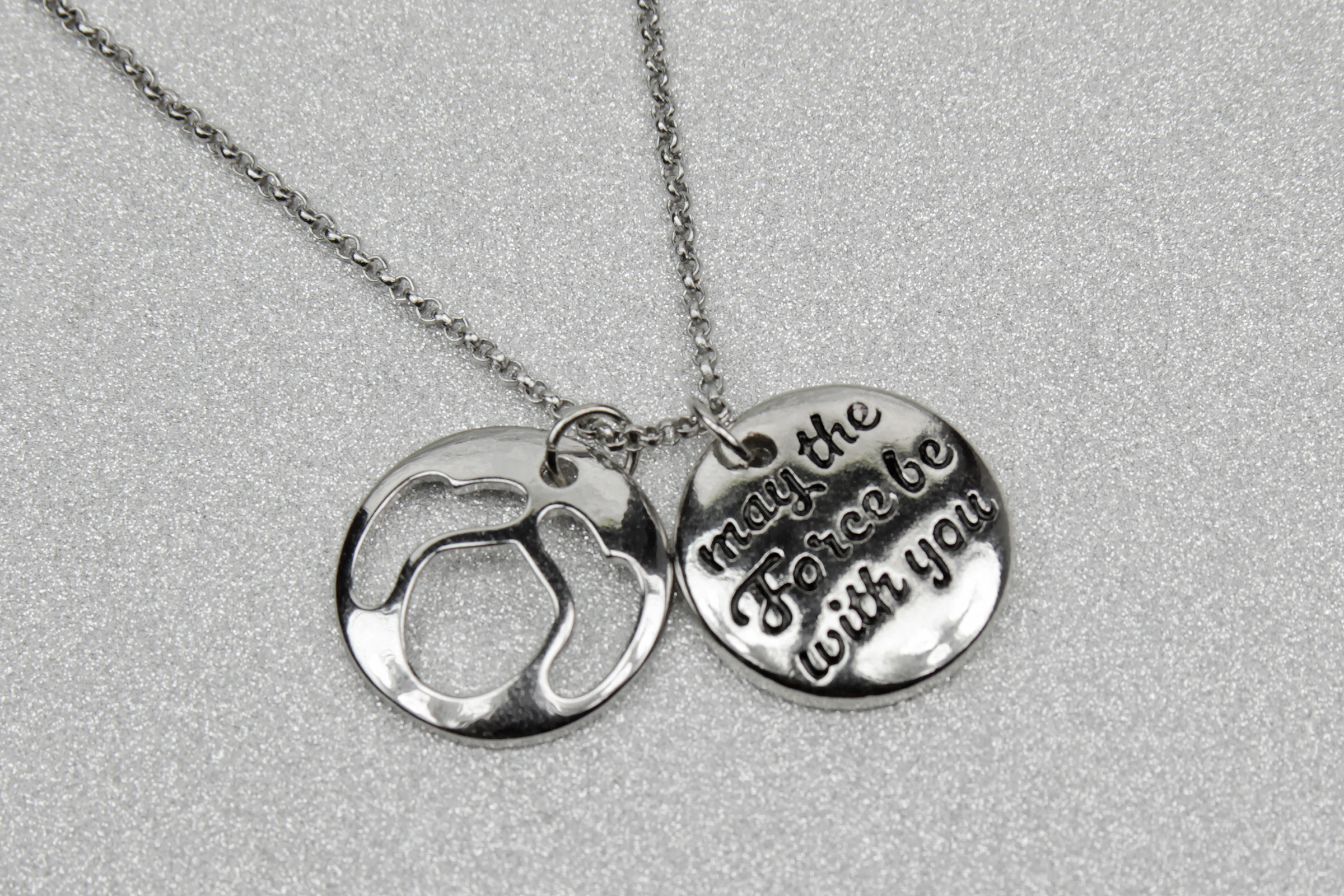 This necklace was sold by ThinkGeek, and I’m so glad I got it as I haven’t seen it since. It features two circular pendants – the first has a cut-out of Leia’s hair bun silhouette, while the second features the text ‘May The Force Be With You’.