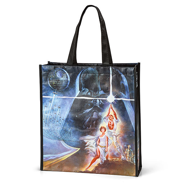 The tote bag features the classic original Star Wars poster artwork by Tom Jung. The bag measures 15″ tall x 14″ wide x 4″ deep, while the double handles have 8 1/2″ drop.