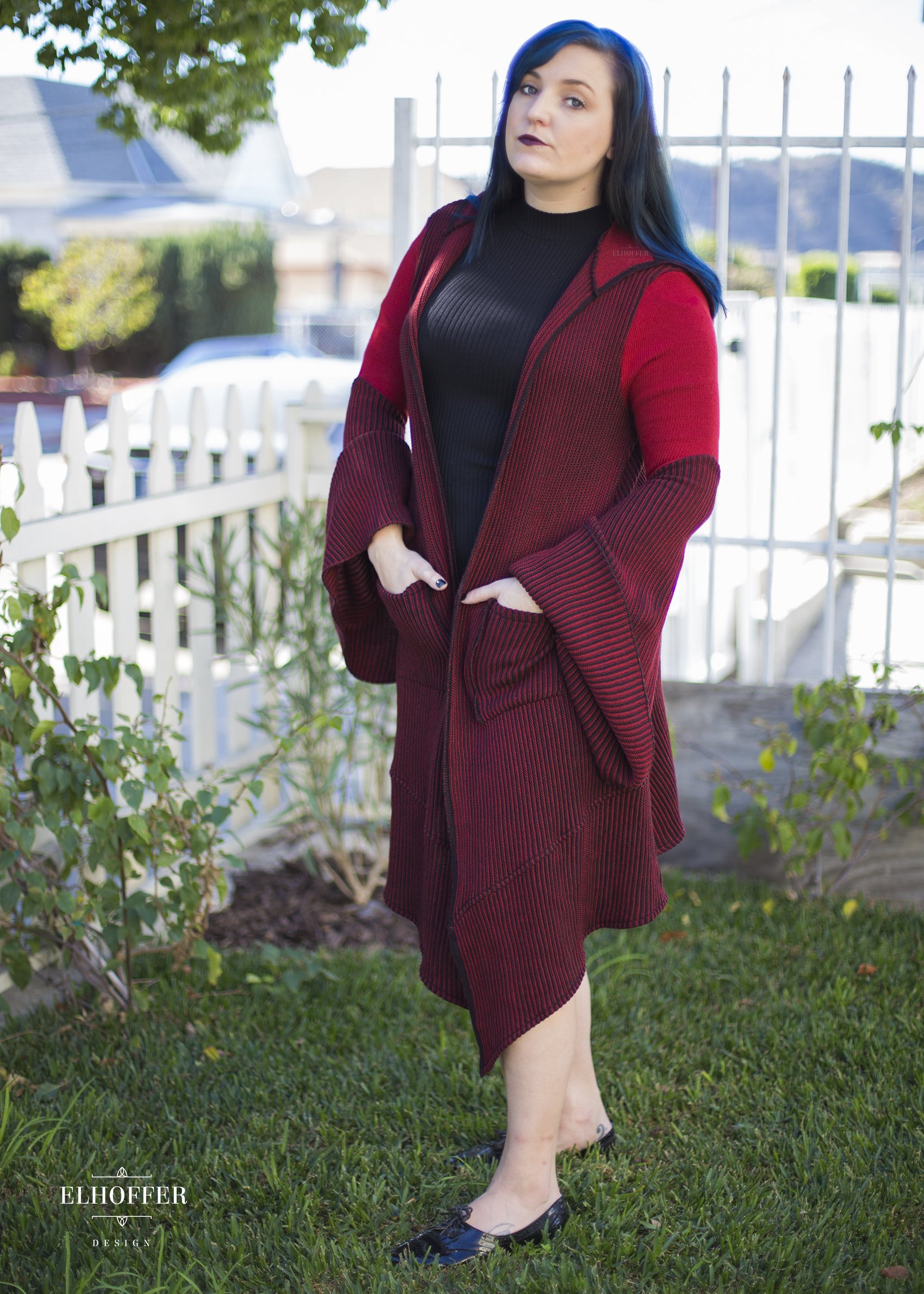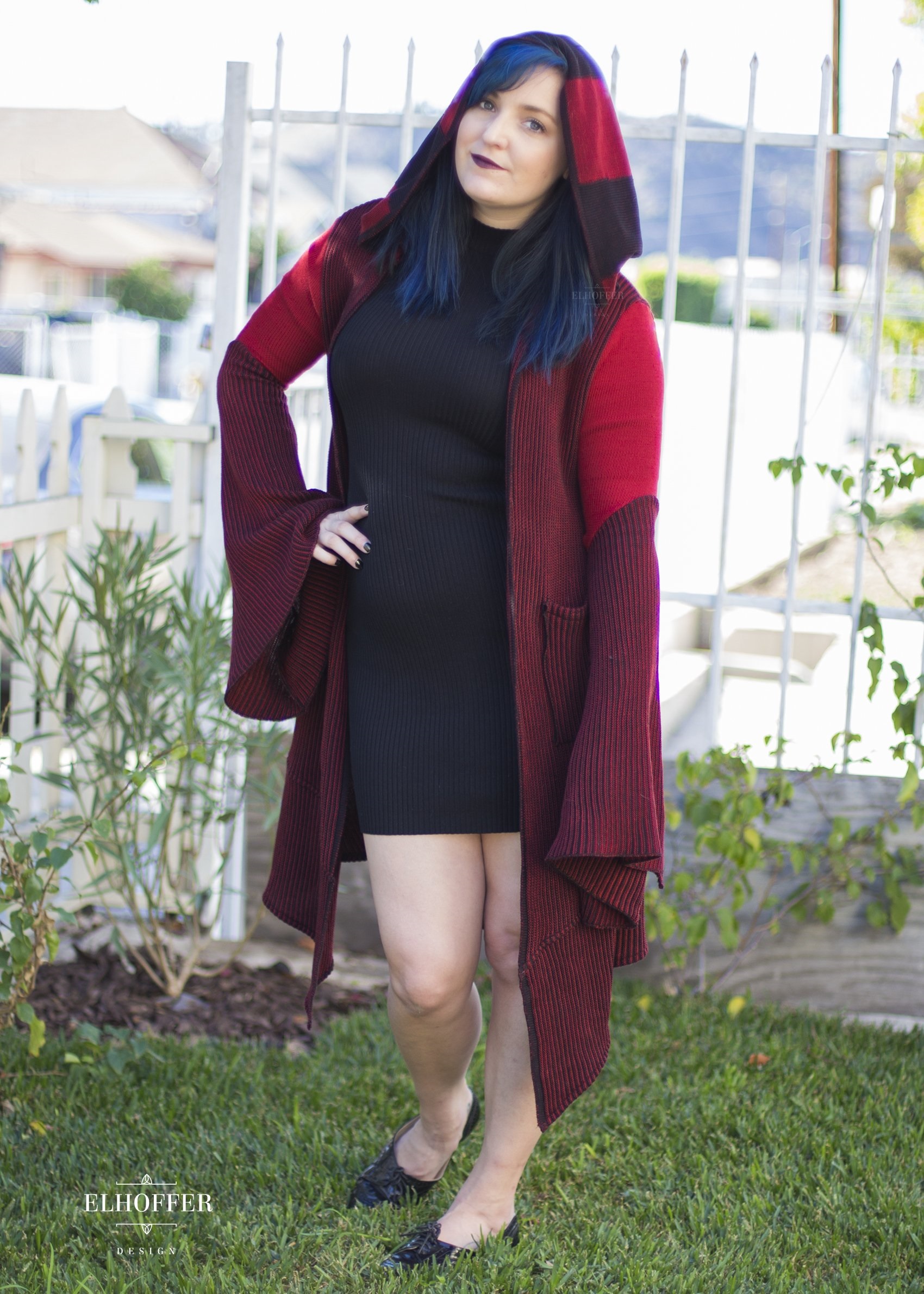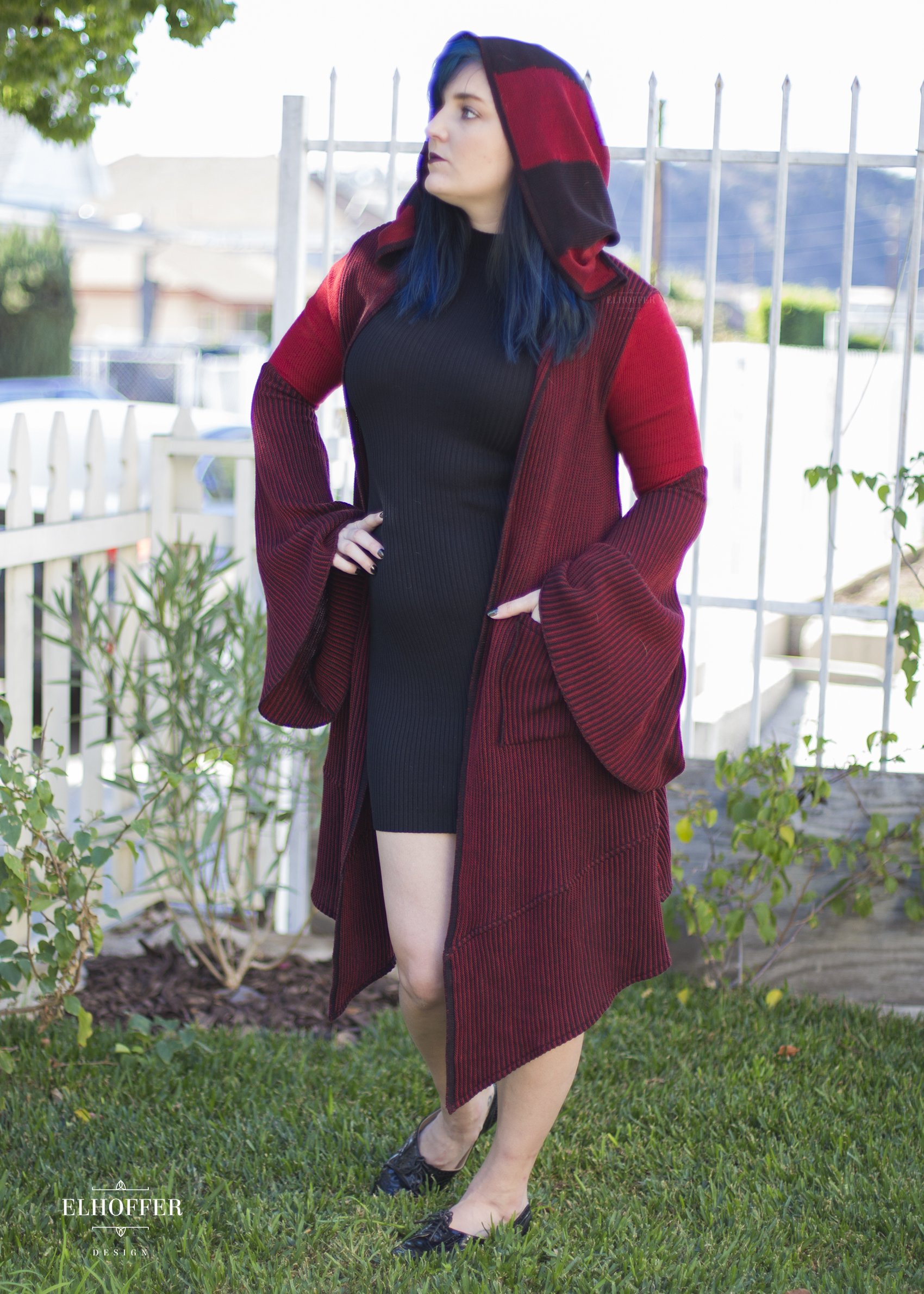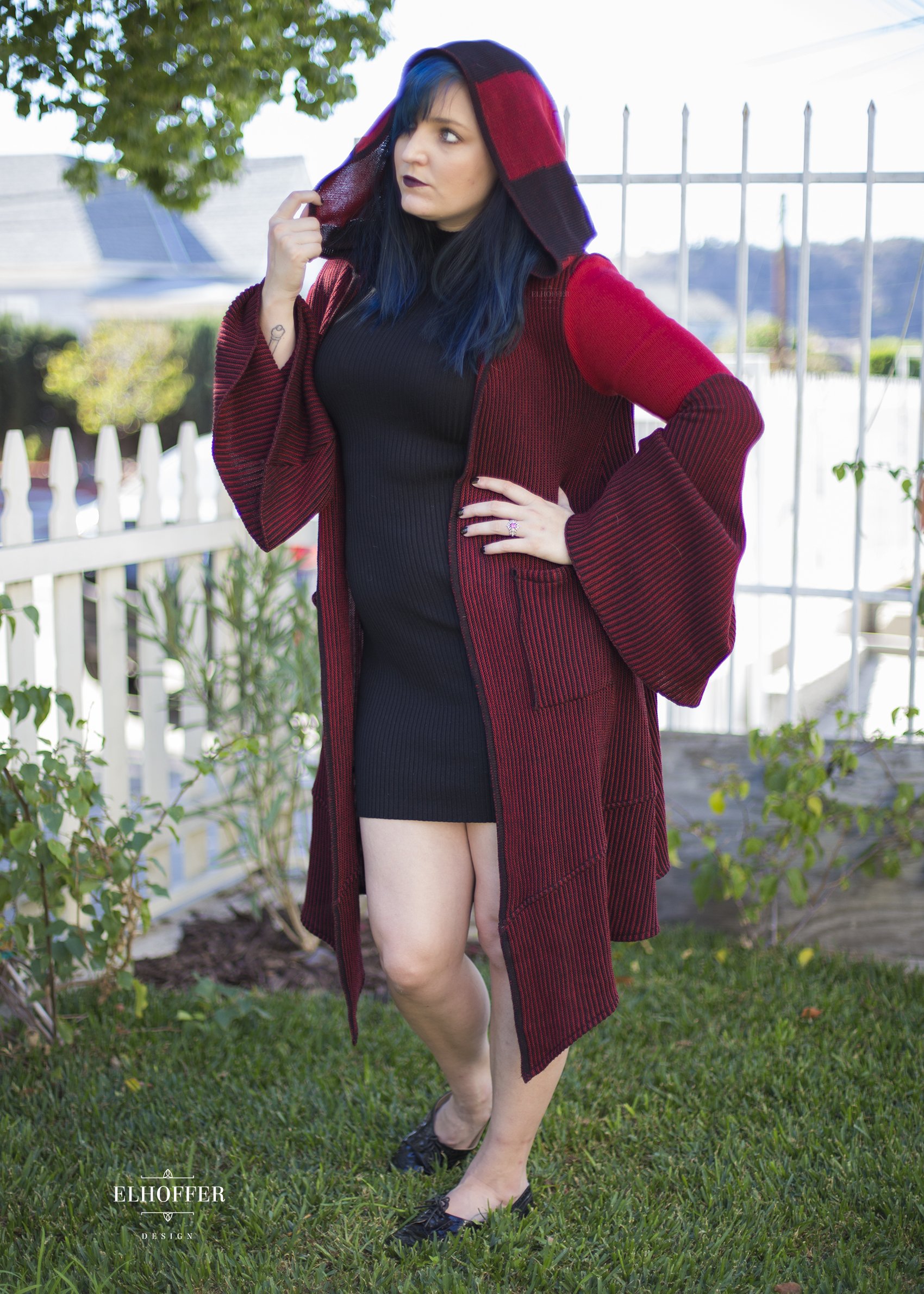 This fantastic new Star Wars Sabe’ inspired Galactic Decoy cardigan is available for pre-order from Elhoffer Design. This longline cardigan is inspired by Sabe’s ‘Queen Amidala Decoy’ battle outfit from The Phantom Menace. The cardigan features flared bell sleeves, pockets, and an oversized hood.