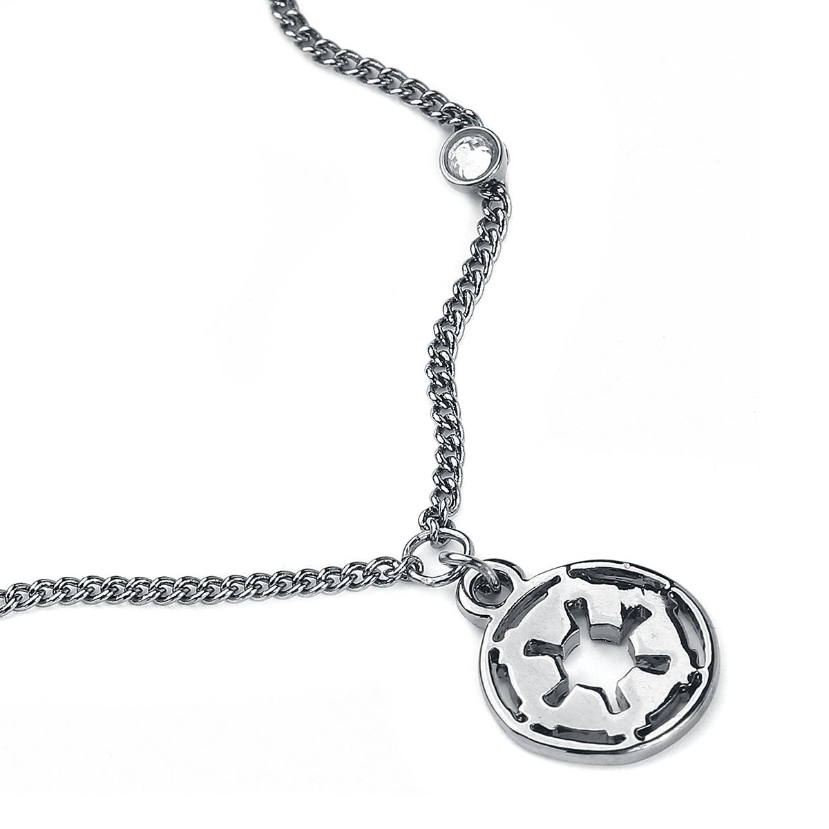This Star Wars Galactic Empire Symbol bracelet is available at EMP Online. The dark-toned chain bracelet features a cut-out Galactic Empire ‘cog’ symbol charm, and a small clear rhinestone gem accent on the chain. The bracelet is adjustable, with a lobster claw-style clasp and length of wider adjustment chain (length approximately 15.5cm to 22cm).