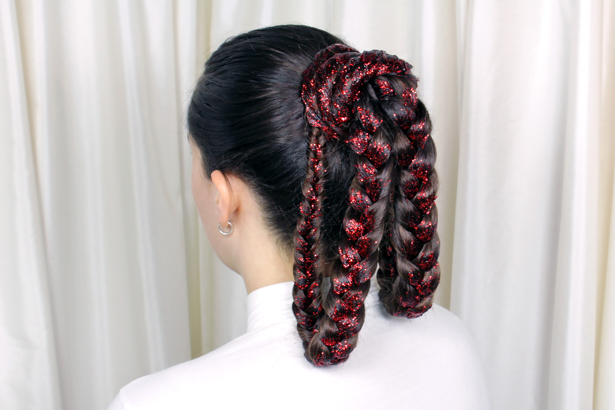 Next up – the glitter! I choose red glitter, as a reference to the outfit Lando gives Princess Leia to wear on Bespin. I used a small bottle of cheap craft glitter, and a small tub of clear hair gel. I put a small ‘glob’ of hair gel in a little bowl, and poured in the glitter while mixing the two together, until I had a good consistency – enough gel to get the glitter to stick to hair, but still enough glitter to really stand out. Using a soft makeup brush, I painted the hair gel/glitter mixture onto the braid, then applied the rest on the ponytail base.