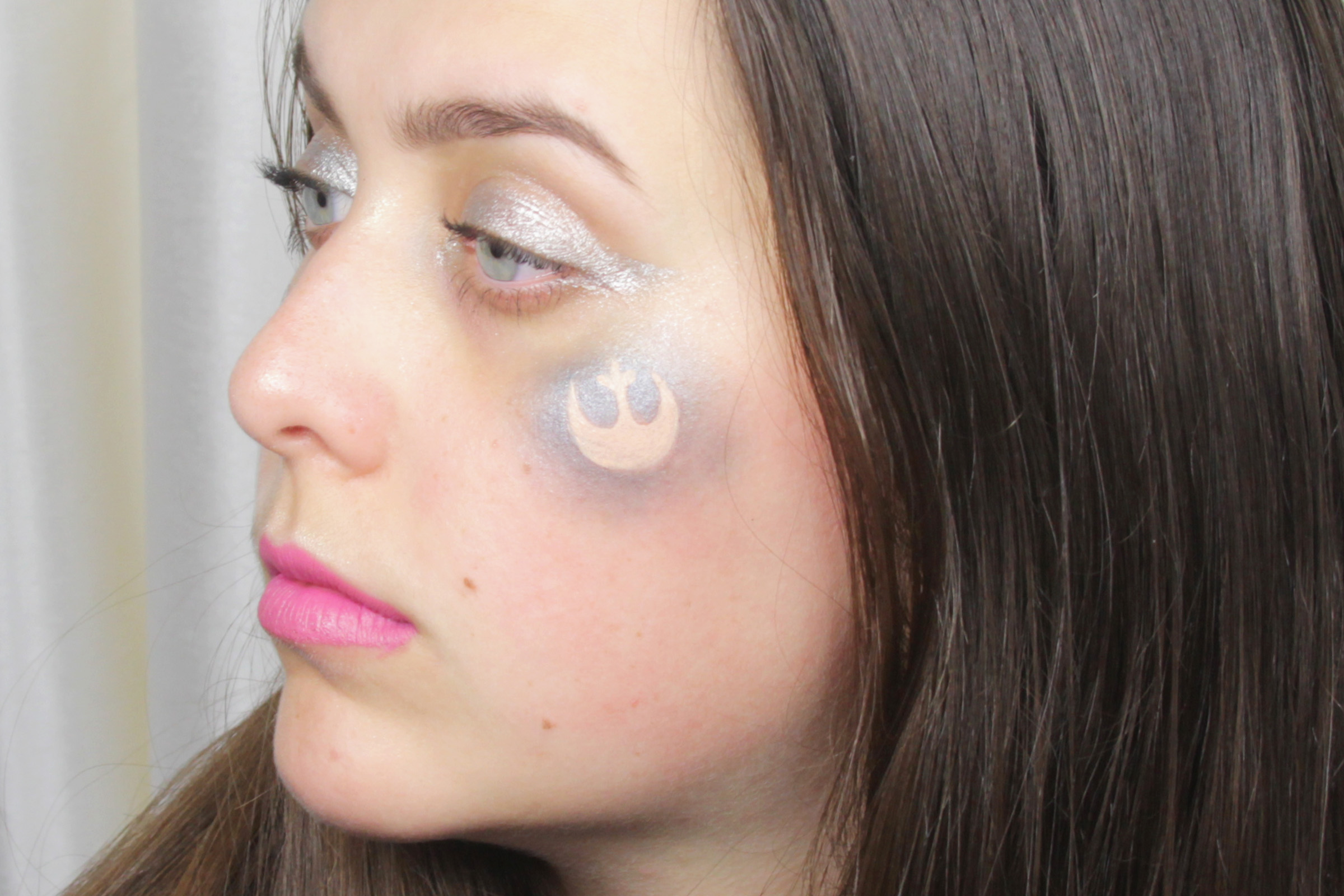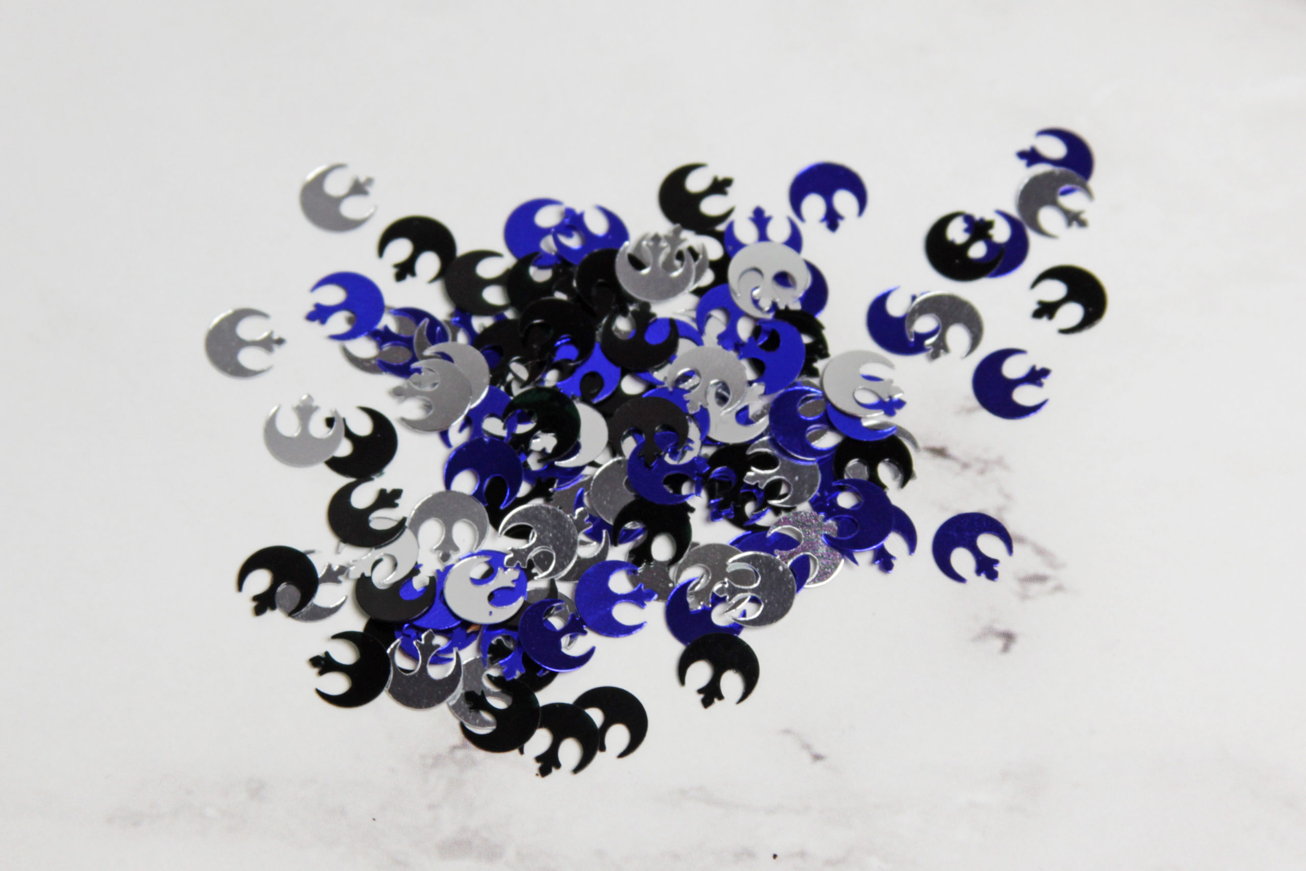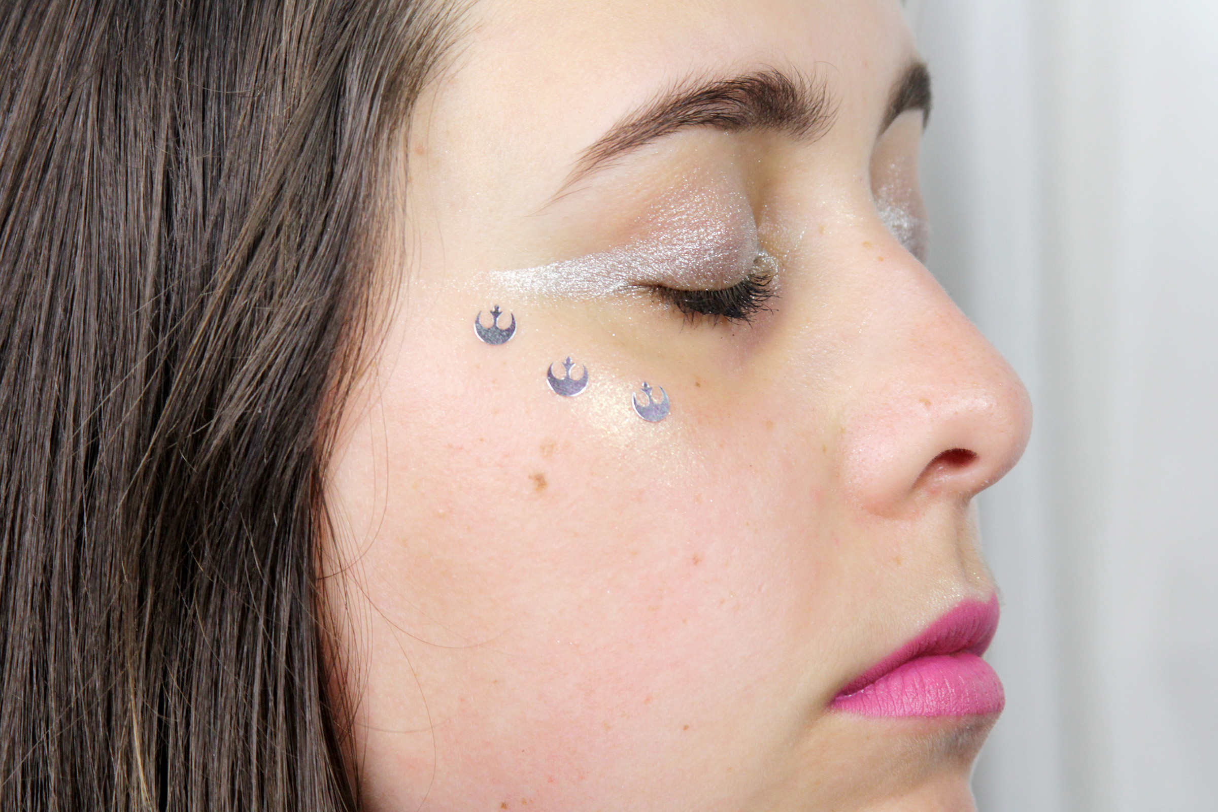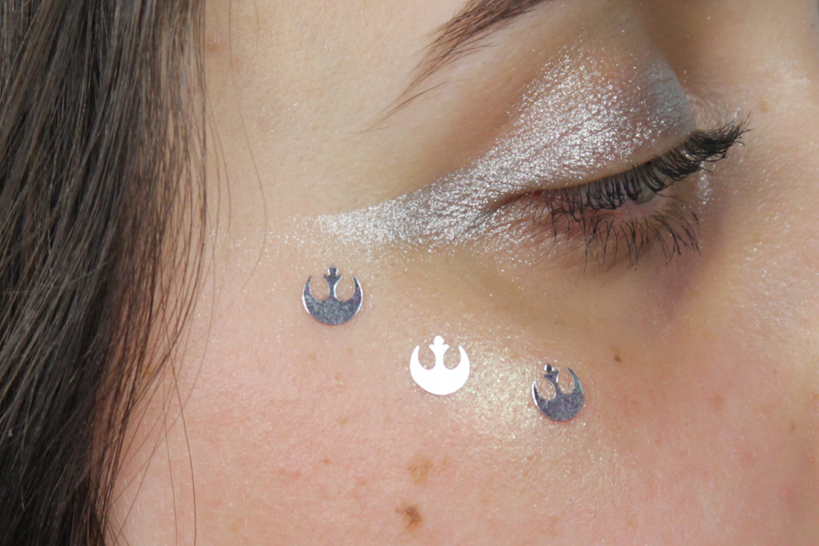 The key piece of this look is Rebel Alliance symbol confetti. I found this tiny little Star Wars confetti last year, and knew it would be perfect for adding to a makeup look. This particular confetti came in silver, black, and blue – I haven’t been able to find it again since, but I’m definitely on the look-out for more.
