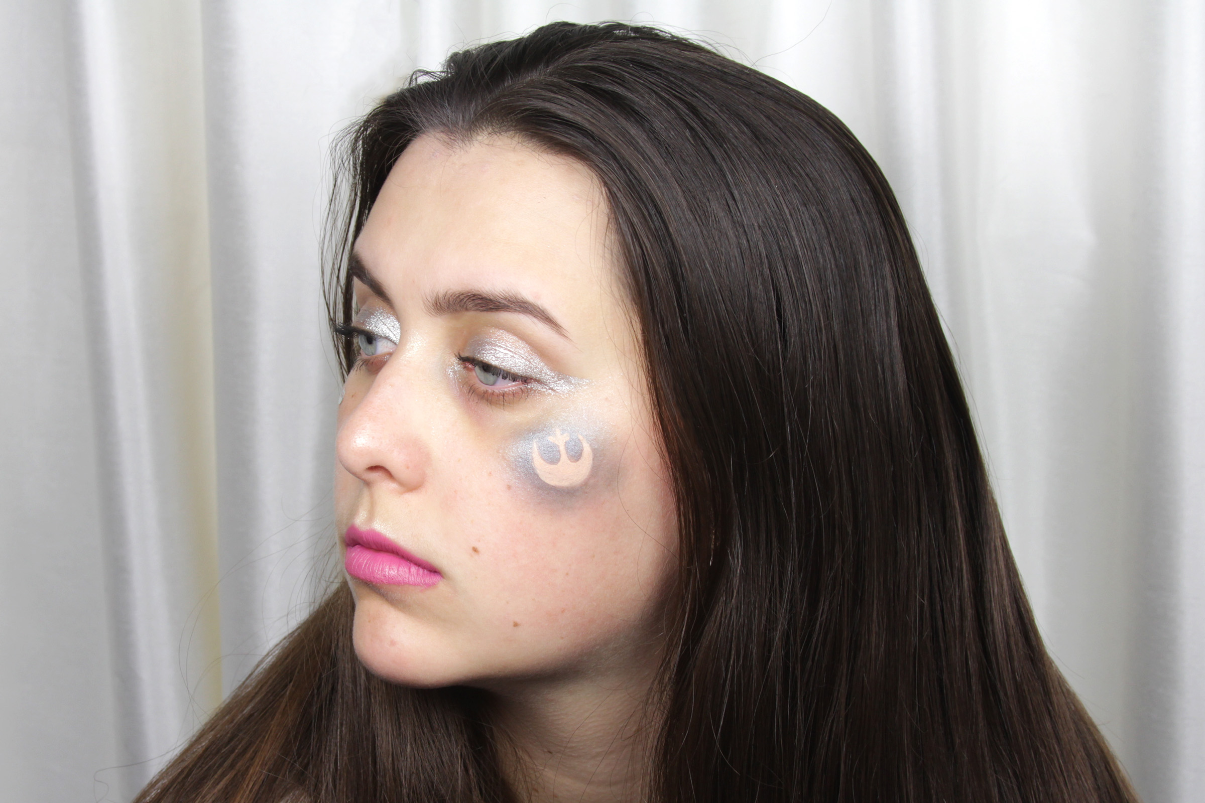 To try out another makeup idea, we also added a larger Rebel symbol on the other cheek. Using a darker metallic silver eye shadow, we used a small cut-out symbol as a stencil for the eye shadow. We then took a small makeup brush and liquid foundation to fill in the symbol and clean up the lines.