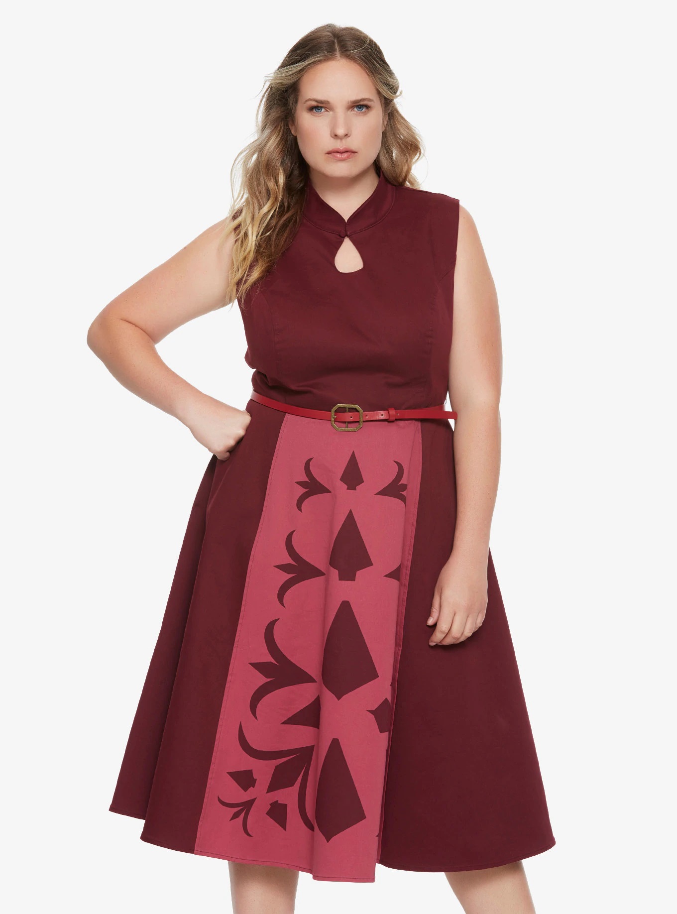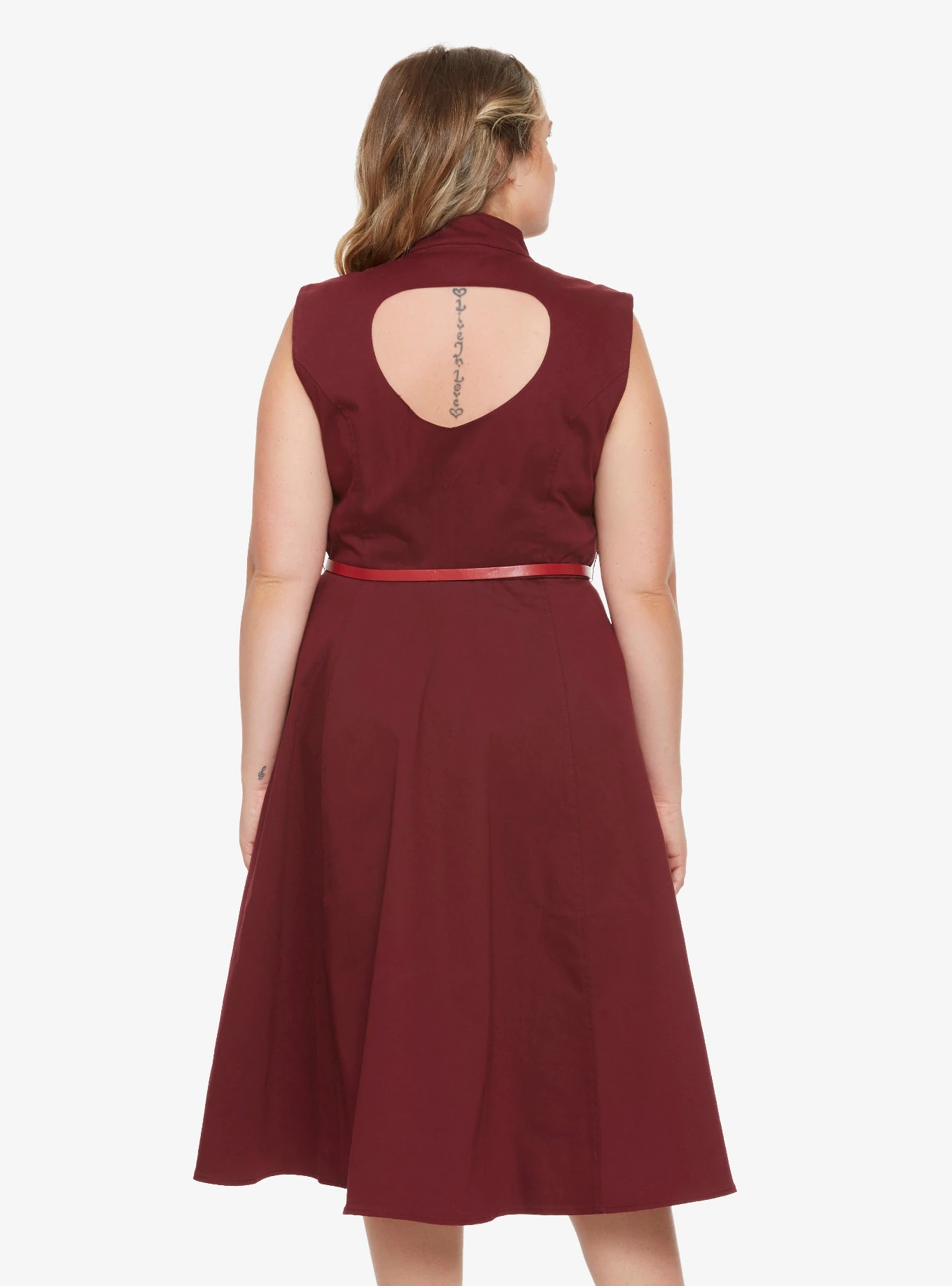 Feeling a little snippy? Channel your inner Jedi in this burgundy fit and flare dress from Star Wars: The Clone Wars. This mid-length dress is inspired by Ahsoka Tano’s costume from the animated series and features a keyhole neckline, red belt, faux-suede panel, and back cut-out that mimic her tunic.