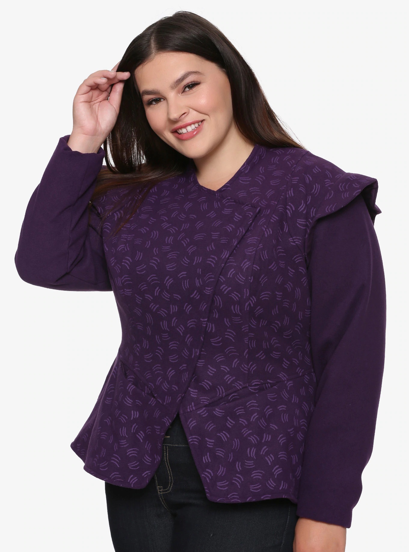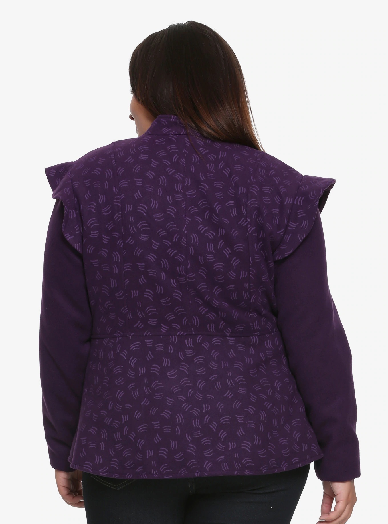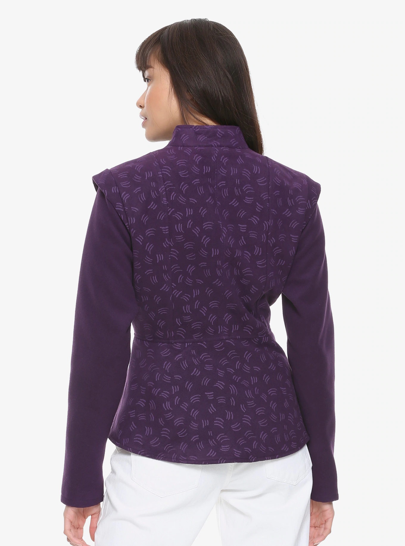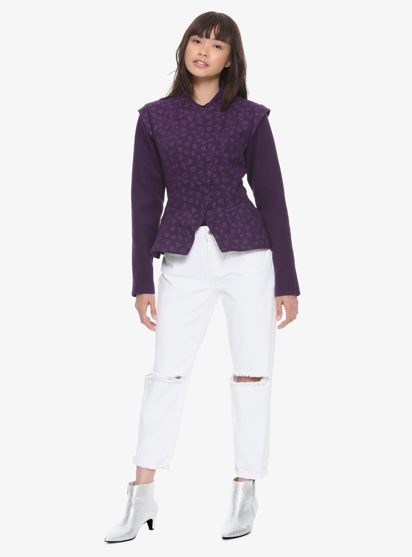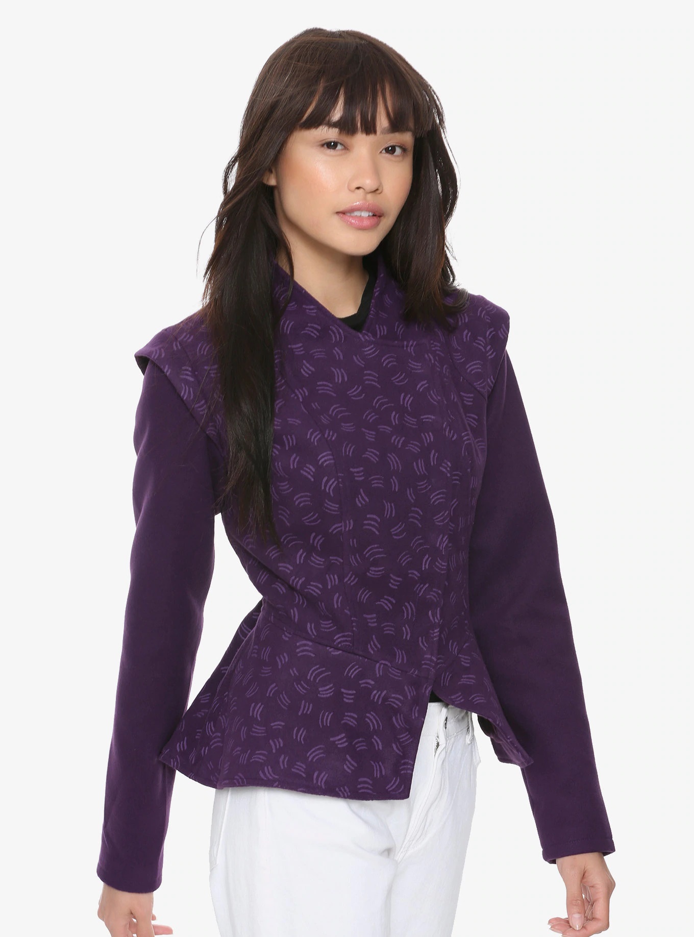 Senator Padmé Amidala wore several costumes throughout Star Wars: The Clone Wars, but we thought we’d honor her position as Senator and make a constructed blazer inspired by one of her Senate gowns. This purple blazer features a crossover, snap-closure front, a peplum body shape with peaked shoulders, and a tonal pattern on the chest panels. It’s made from a heavier fabric – to keep you warm no matter what planet you’re on.