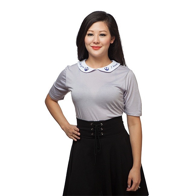 Thinkgeek has a new exclusive women’s Star Wars shirt available, made by Her Universe. The grey shirt features a Peter Pan style collar with the text ‘I Love You’ and ‘I Know’ embroidered on each side (front left, front right), together with the Rebel Alliance symbol. This top looks great on its own, or tucked in with a high waist skirt as pictured. I think this shirt is lovely, the perfect attire for a romantic evening out, or just celebrating Princess Leia and Han Solo.