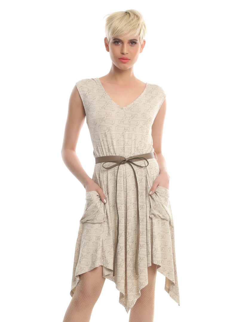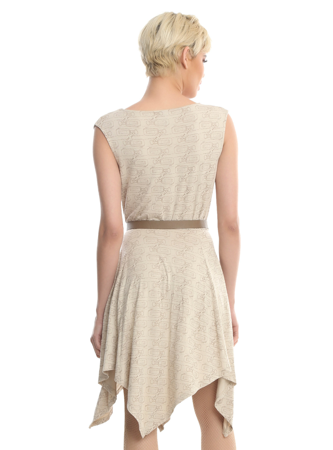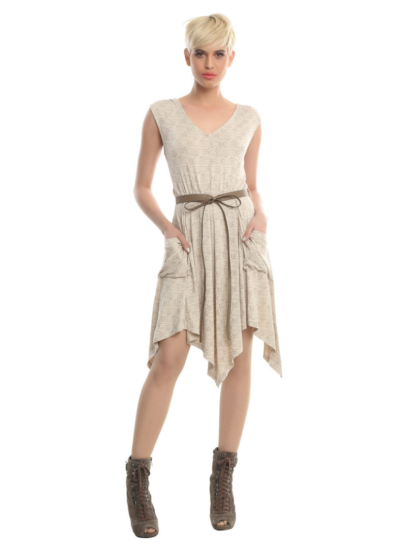 The long awaited Her Universe Rey dress is finally available! Part of the Star Wars Episode 7 collection designed by the winners of the Her Universe Fashion Show last year, the beige dress features an all over light brown print of Rey on her Jakku speeder. The sleeveless dress also features front pockets, a faux leather belt, and a handkerchief style hemline.