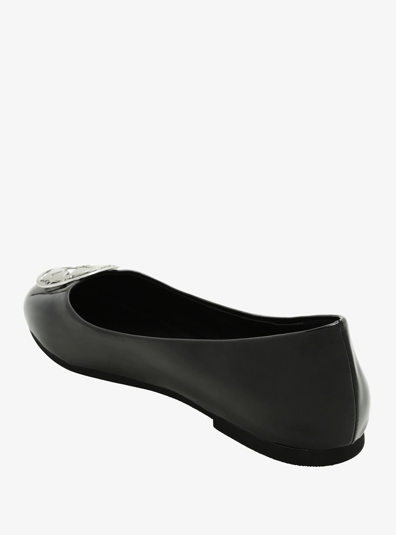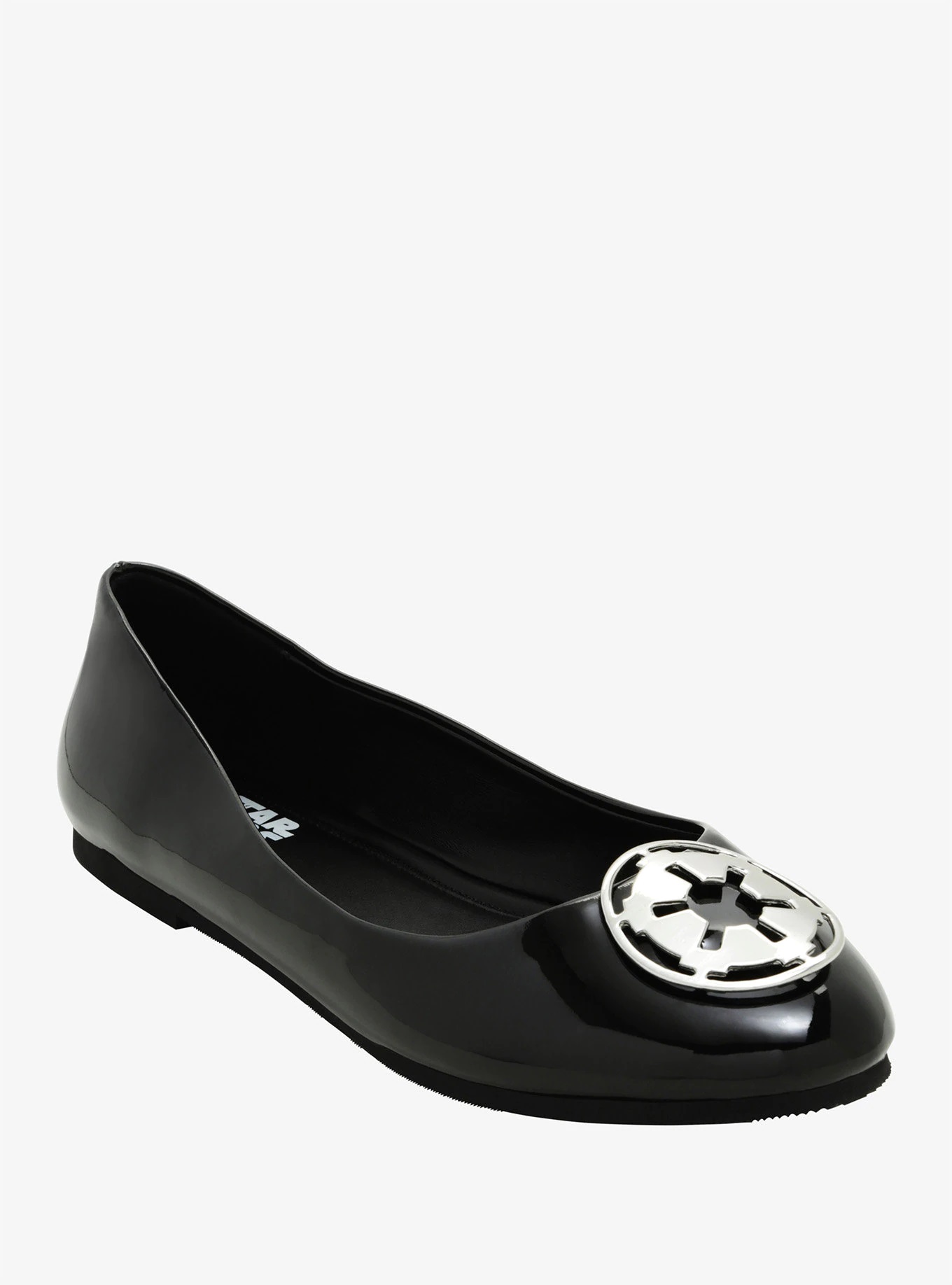 Going on a date with Darth Vader? Don’t forget to wear your black patent leather flats! They feature silver tone Galactic Empire logo accents at the toes.