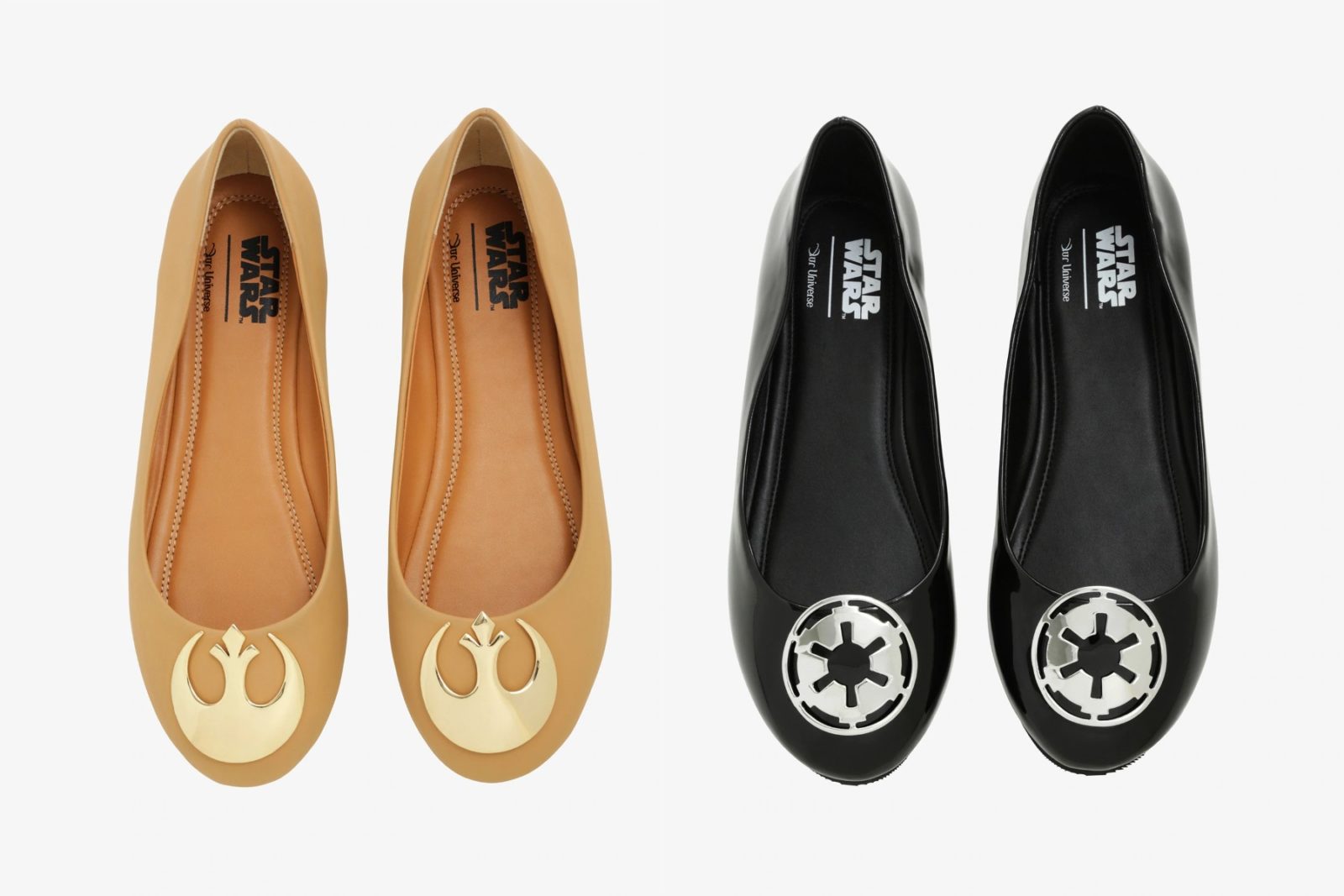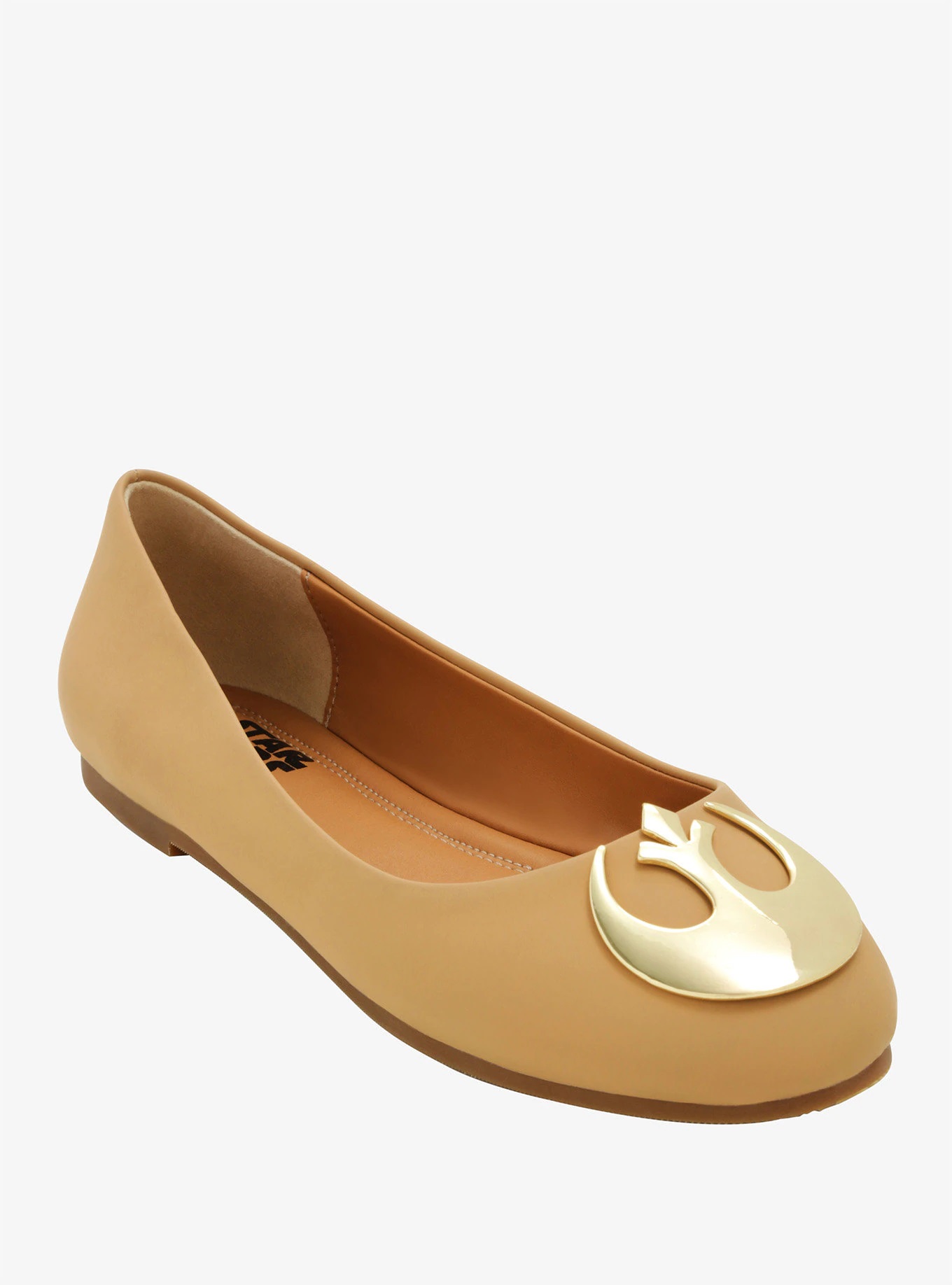 Going on a date with that hunky Rebel fighter pilot? Don’t forget to wear your tan Rebel Alliance flats! They feature gold tone Rebel Alliance logo accents at the toes.