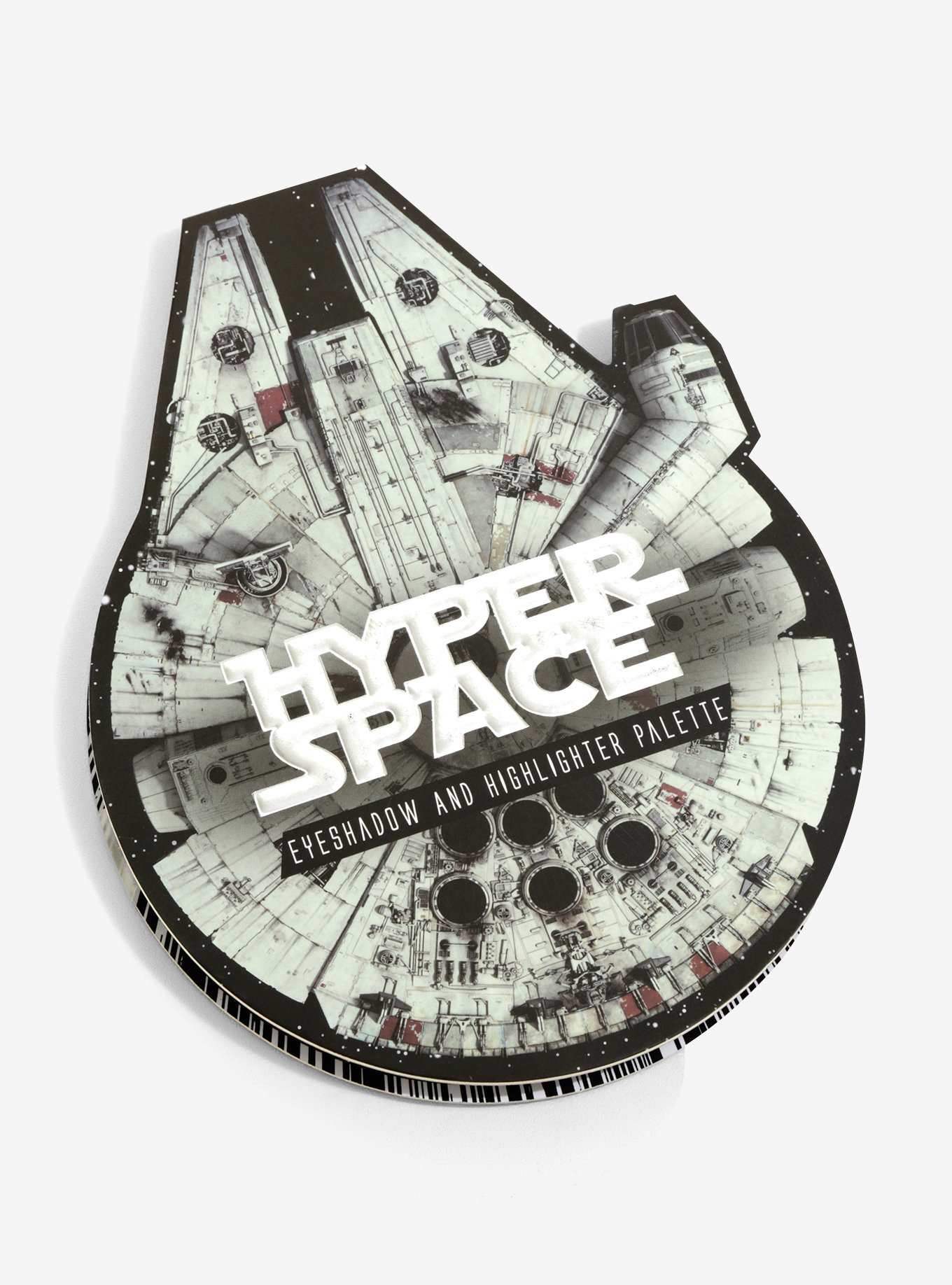 The Hyperspace palette packaging is in the shape of the Millennium Falcon, which opens up to reveal 16 colourful eyeshadows, each with a neat Star Wars inspired name. In the center is a pearlescent highlighter, with a debossed Rebel Alliance logo – there’s also a cute little Rebel makeup applicator!