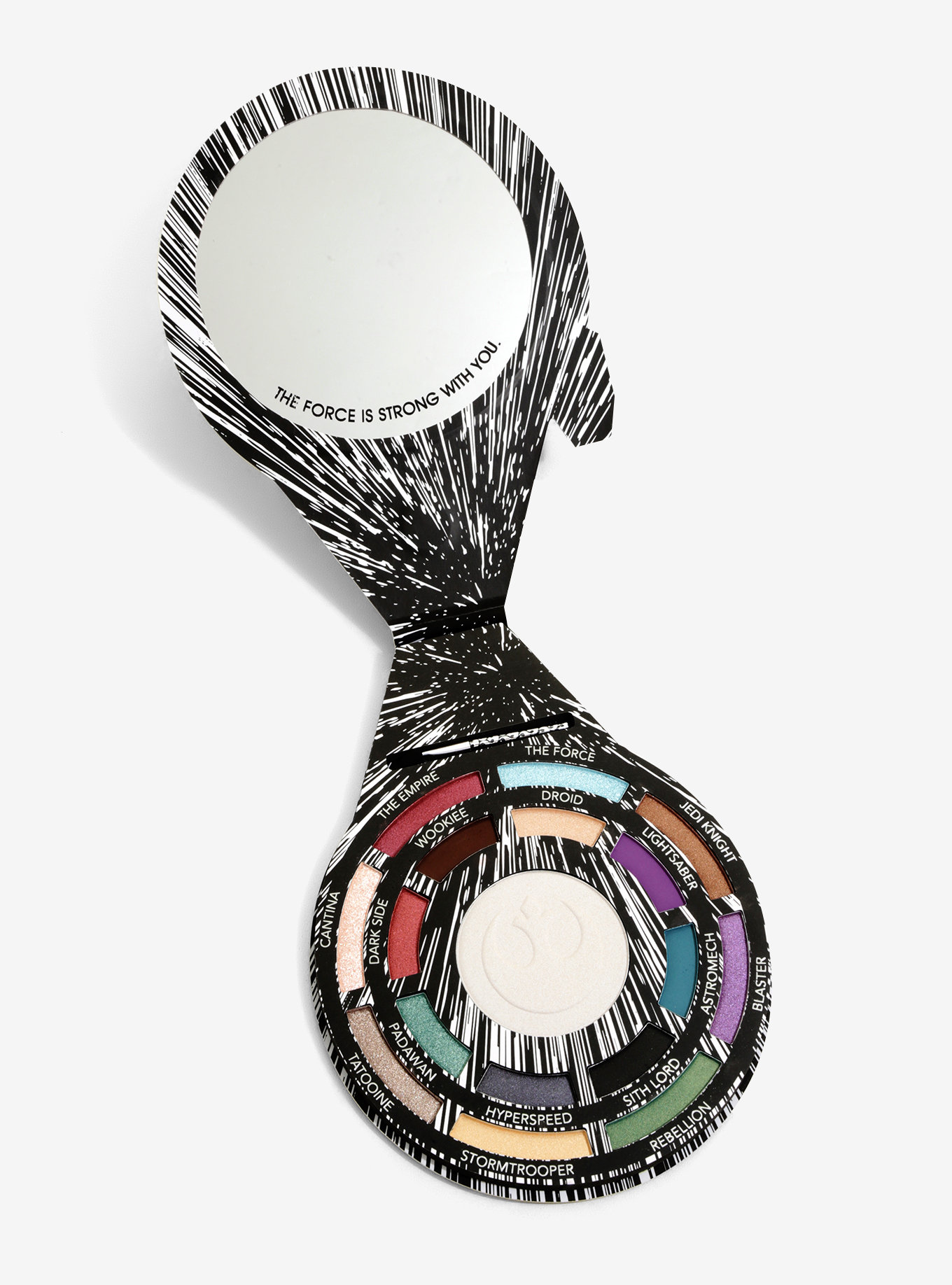 Get ready to launch your look into hyperspace! This combination highlighter and eyeshadow palette from Her Universe and Star Wars features sixteen bold and beautiful matte and shimmer colors inspired by the timeless space epic. Wookiee, Lightsaber, Astromech, Stormtrooper, and Sith Lord will give a bold matte look on your eyelids, while Blaster, Droid, The Force, Hyperspeed, Padawan, Rebellion, The Empire, Cantina, Jedi Knight, and Tatooine are going to bring the shimmer and shine to your eyes. Finish off your face by highlighting with the pearlescent highlighter in the center that features a debossed Rebel logo.