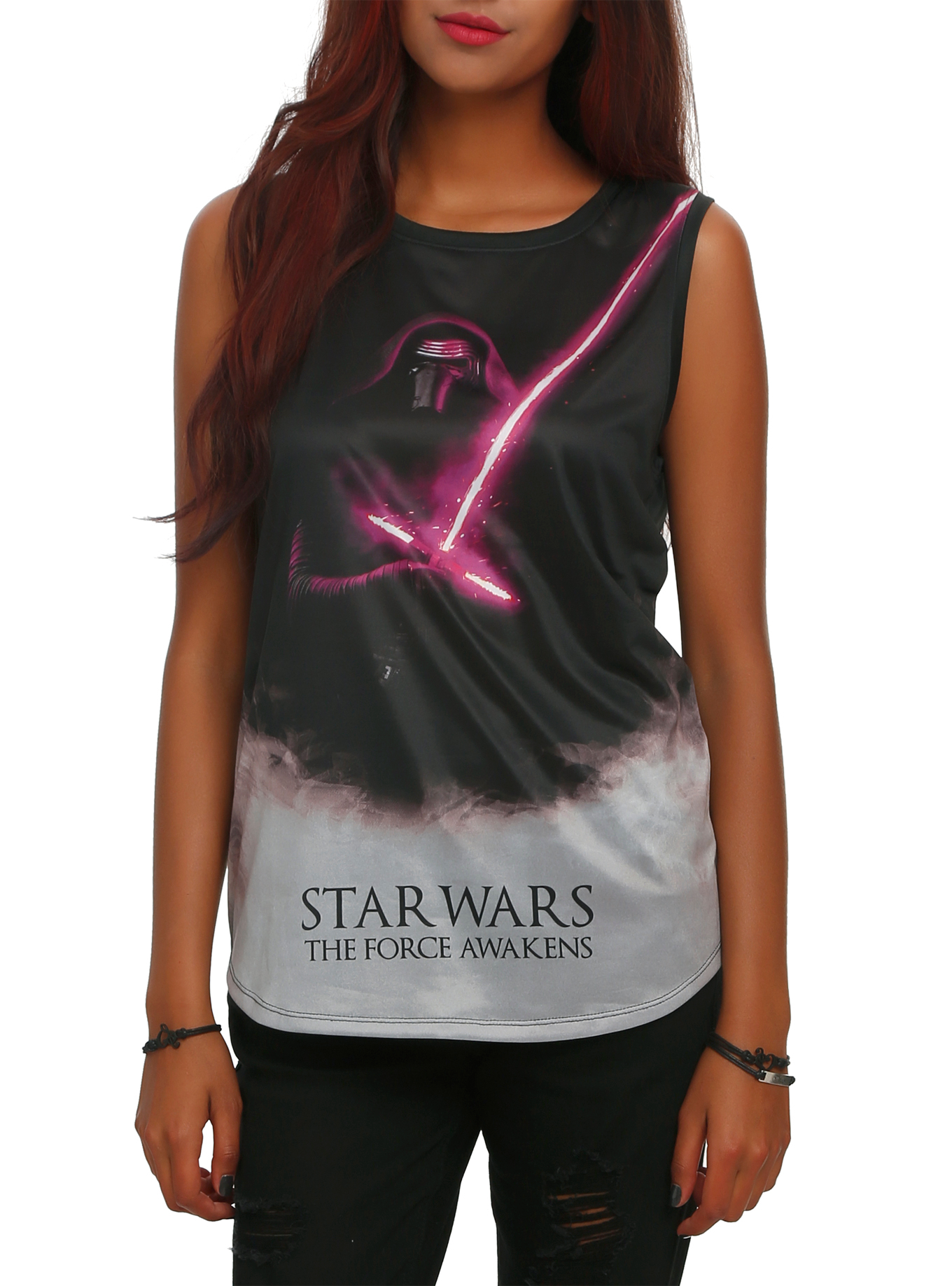 Hot Topic has added their Force Friday range of Star Wars items to their website! The range (so far) includes 5 women’s tops, featuring BB-8, Kylo Ren, Captain Phasma and Rey. All of the new tops are priced from US$24.50 to US$28.50 (depending on size) – Hot Topic has a current promotion of ‘buy 2 get 1 free’ with the code ‘SCHOOL’ and all of these new tops are included in the promotion! All of these new tops are available in sizes XS to 3X, though the Kylo Ren muscle tank top is currently only showing XS and 3X (none in between), hopefully that’s just a glitch and the other sizes will be available soon. I love this whole collection so much – those hi-lo hem tank tops would be perfect for wearing over leggings (I wonder if we will see Episode 7 themed leggings?).