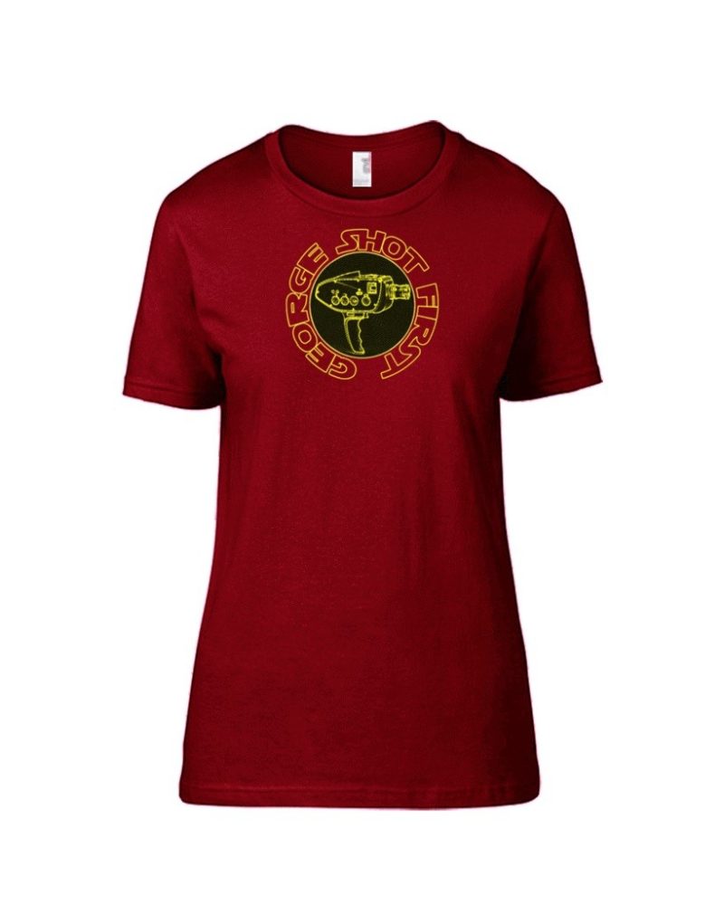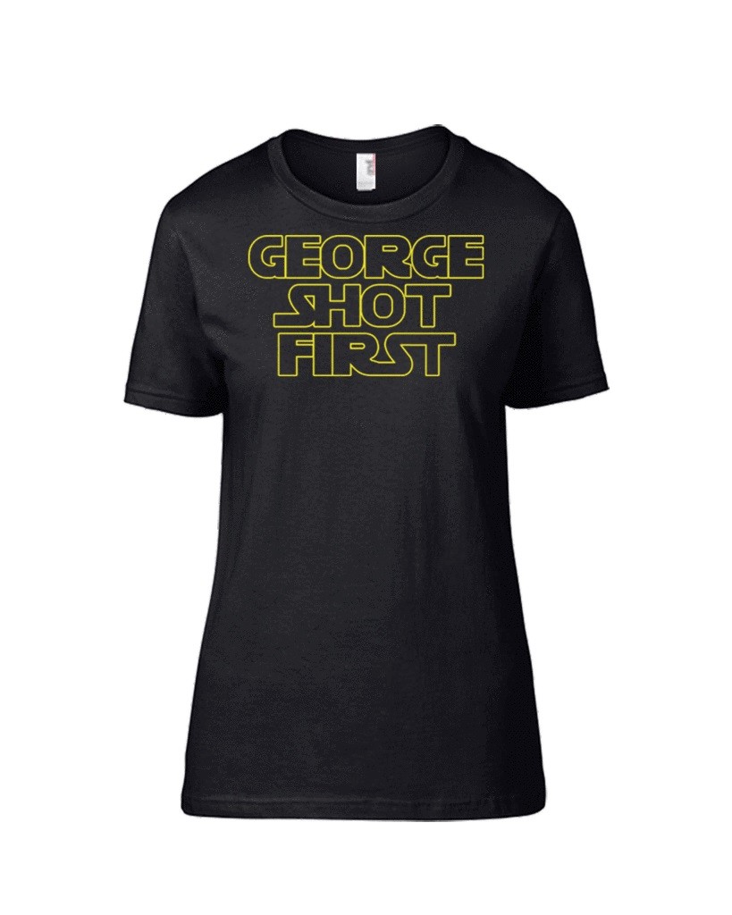Today’s Mos Eisley Marketplace article features the geek apparel company George Shot First. I first heard about this label through the recent Prequel Appreciation Day fan event, and I love their message of positivity within the Star Wars fan community. They currently have three t-shirt designs, available in women’s styles – each celebrating George Lucas. George Shot First can ship internationally, which is great.