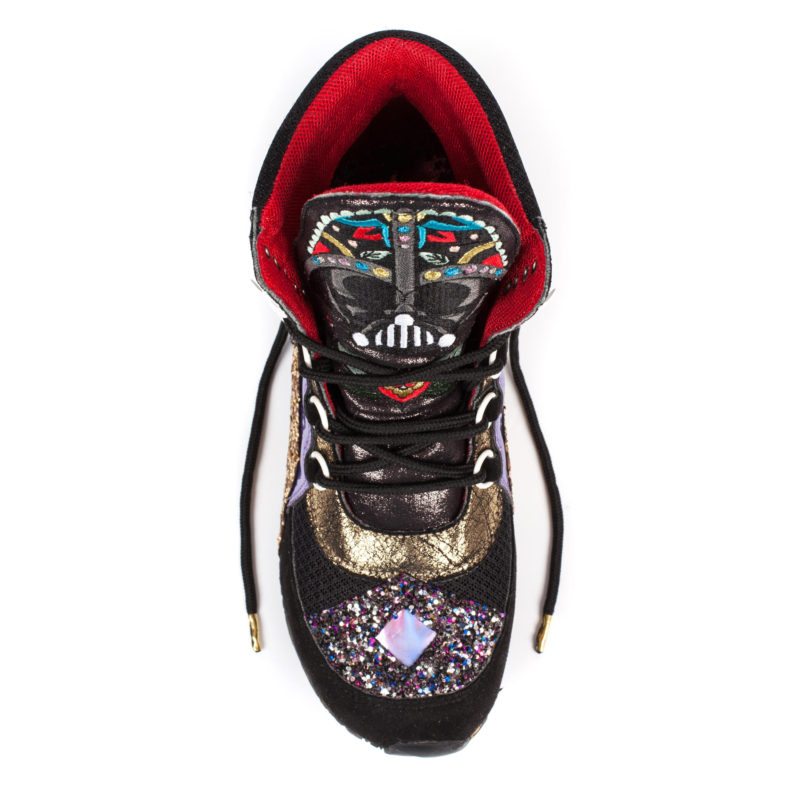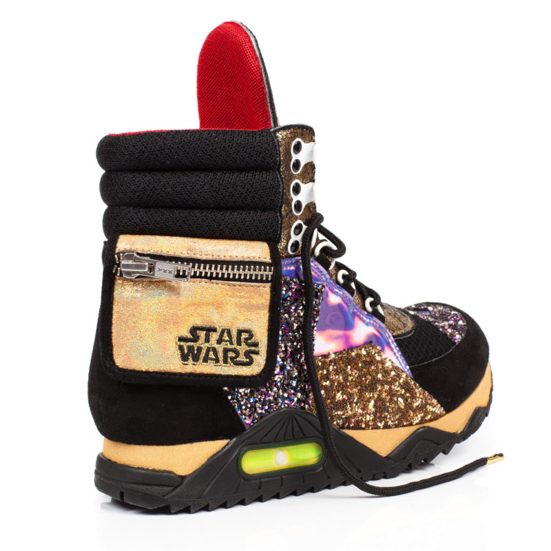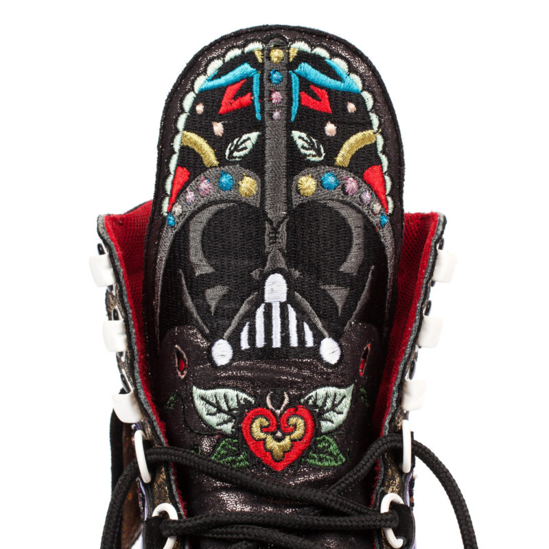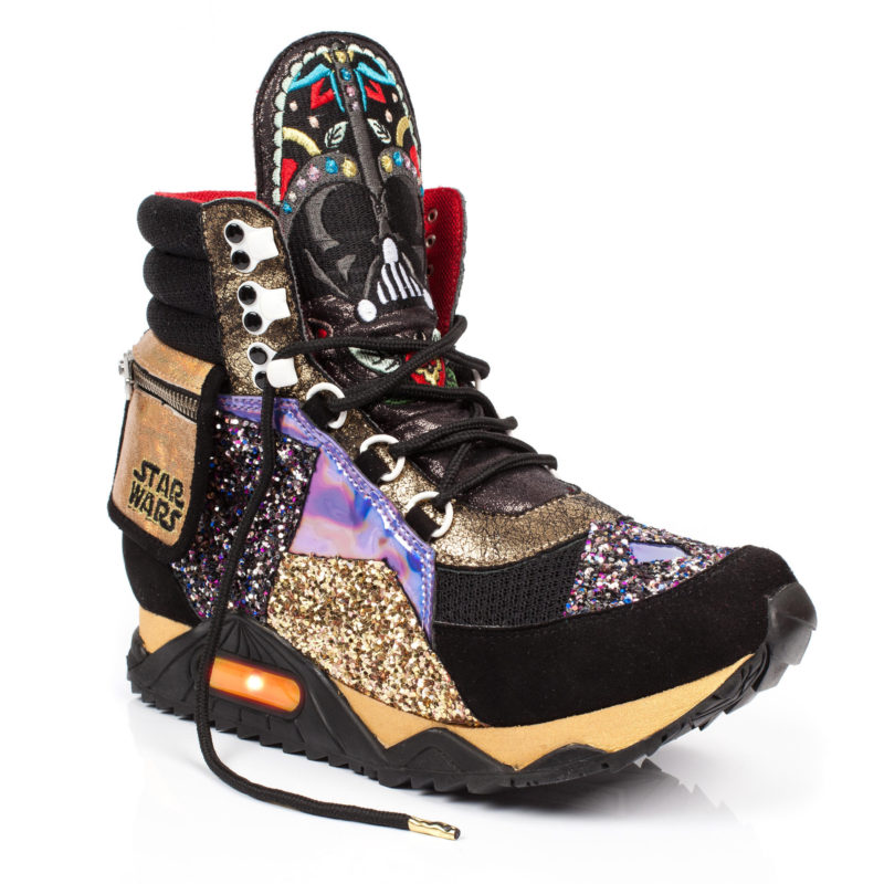 Irregular Choice has revealed the next style in the upcoming women’s Star Wars footwear collection – Darth Vader high tops! These ‘R Series Vader’ trainers feature an embroidered floral Darth Vader design on the tongue, fantastic glitter side panels, a small outer zip pocket – and flashing lights in the soles! While the first two revealed designs (Glitter R2-D2 flats and Golden Vader heels) use elements from the earlier range, this is the first style revealed that is completely different to the designs from the first collection. Just like all the Irregular Choice footwear, I love them the more I look at them! 🙂 I would love to see these paired with the black Darth Vader leggings from Forever 21, they are such a statement fashion item! I can’t wait to see which design Irregular Choice will reveal next!