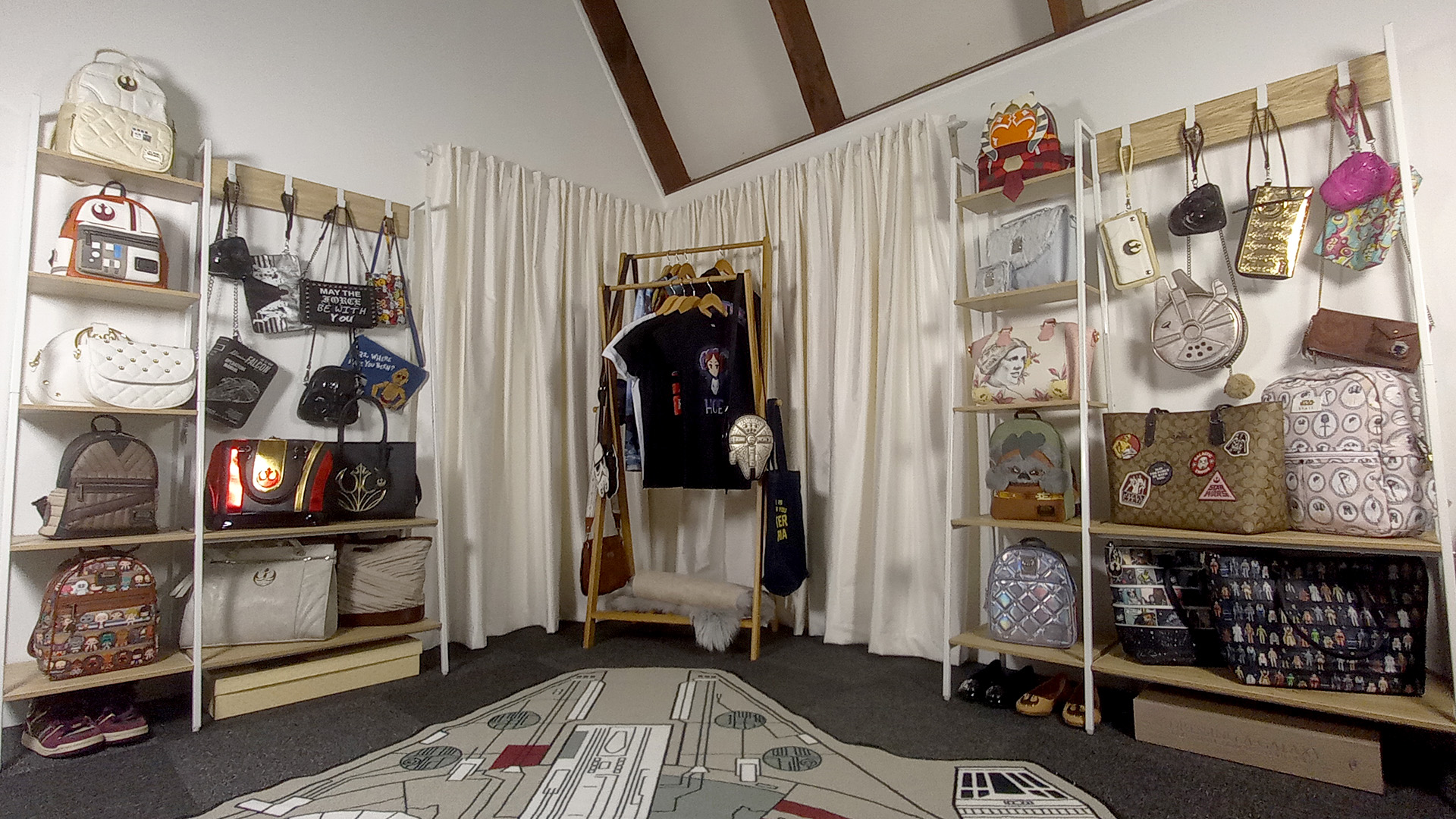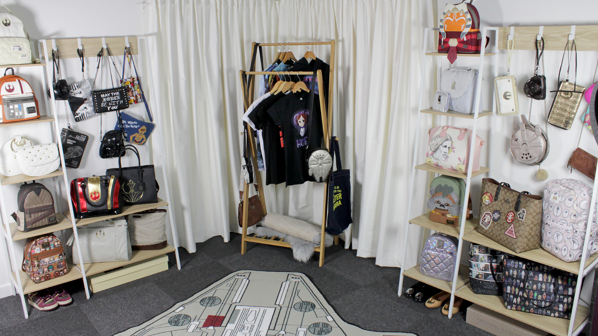 I am so very fortunate to have this amazing space to build my very own Star Wars wardrobe room. To be able to store, display, and photograph my collection of Star Wars fashion in a room like this is just amazing. There are one or two more final touches to add to the room in the future (like a framed art print or two), but for now, it’s done, and I can’t be happier.