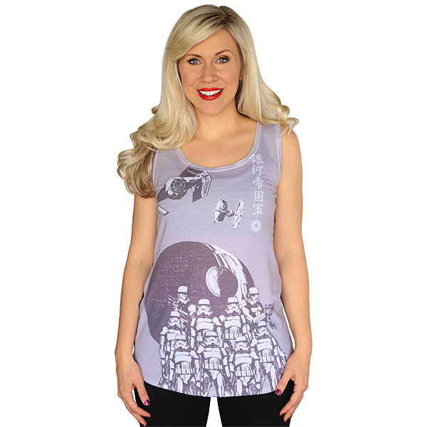 Thinkgeek has added an exclusive women’s Star Wars tank top to their website. Made by Her Universe, the top was previewed back in early February, along with 3 other Star Wars designs. The racer back tank top features a Japanese style Stormtrooper print, which was also used by Her Universe for a dress a few years ago. Available in sizes S to 3X, the top retails for US$19.99 – Thinkgeek can ship internationally.