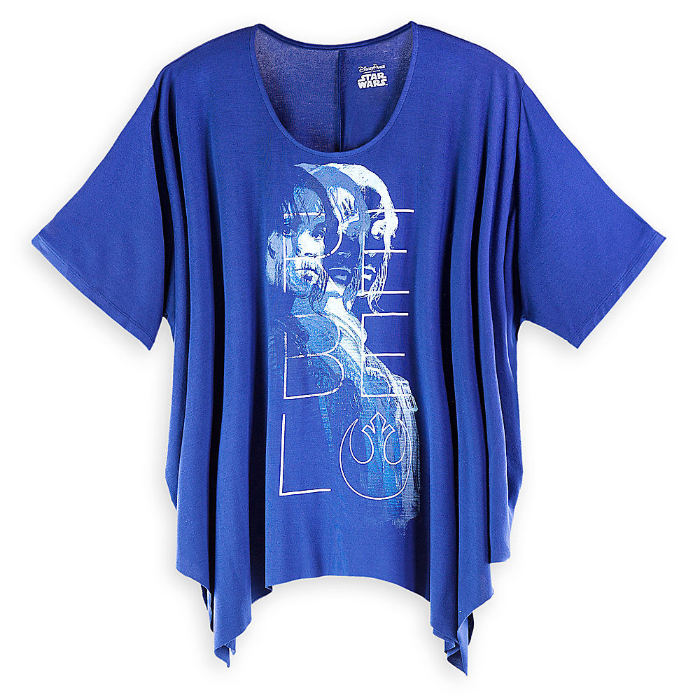 The Disney Store has a new women’s Rogue One fashion top available. The draped blue tee features a handkerchief style hem, and a front print of Jyn Erso with the text ‘Rebel’. This top was part of the Disney Parks Rogue One apparel range revealed for Rogue Friday, so I’m glad to see it available online as well, for fans who can’t visit the US Disney Parks.