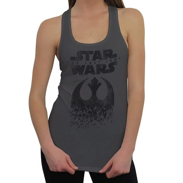 This women’s The Last Jedi tank top is available at SuperHeroStuff. Made from 60% cotton, 40% polyester, the grey racerback tank top features a front print of the Star Wars The Last Jedi logo, and the Resistance ‘starbird’ symbol underneath. The Resistance symbol print has a scattered gradient at the bottom, like the surface of the salt planet Crait.