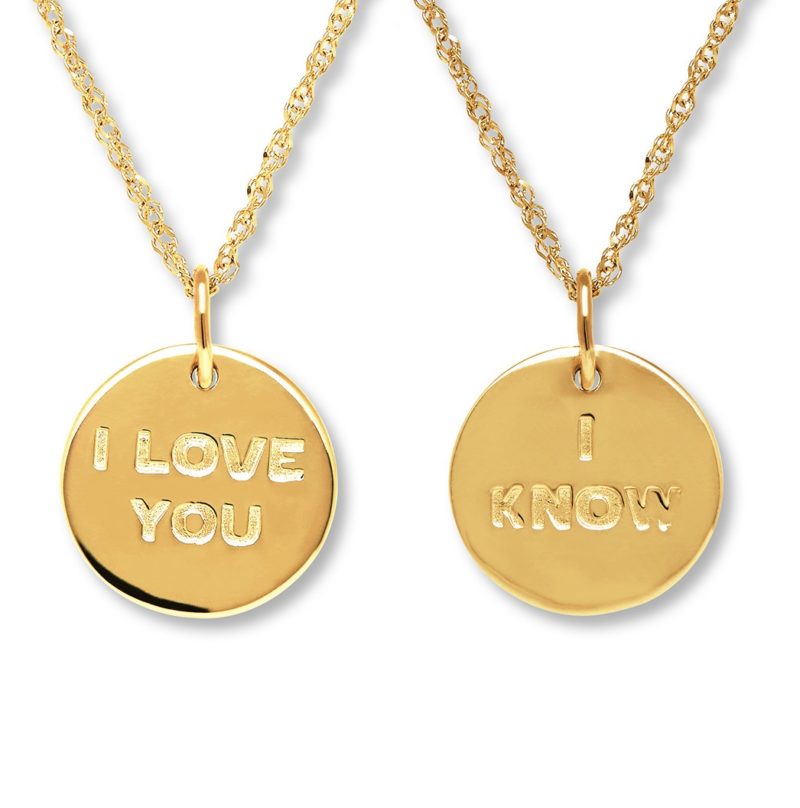 Here are some of our favourite ‘I Love You’ – ‘I Know’ themed jewelry currently available. Prices vary – these stockists can ship internationally, except for Kay Jewelers, and selected Amazon sellers (international customers can order via a mail forwarding service).