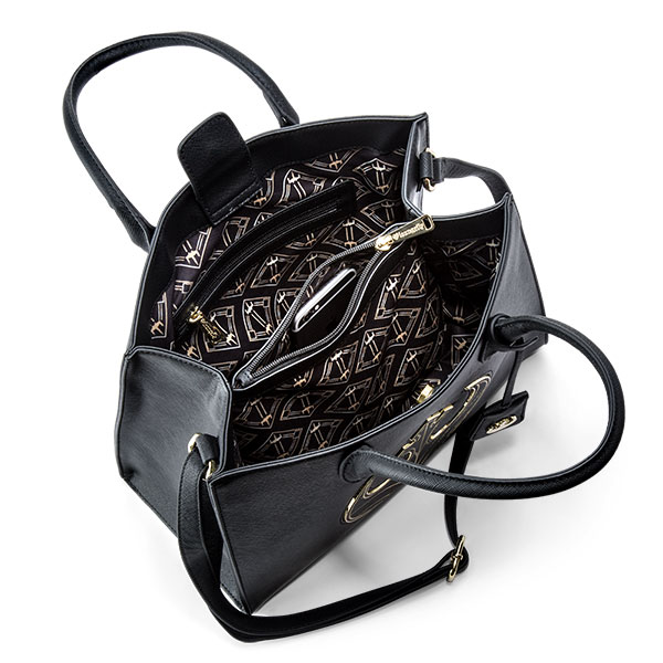 You’ll fit right in with the galaxy’s upper crust when you carry this purse. Featuring the Rebel Starbird with an art deco design and crosshatch textured simulated leather, another Rebel insignia appears on the tag. A generous main compartment is a must to hold all of your casino winnings, and this one is divided in two by a middle zippered compartment. Two small pockets on the inside, one open and one zippered, and the interior fabric features an art deco X-wing pattern. Adjustable long straps and small hand straps make it easy to carry, no matter what the size of your species is. A magnetic snap keeps it all closed, so you only have to worry about losing your wallet in the games.