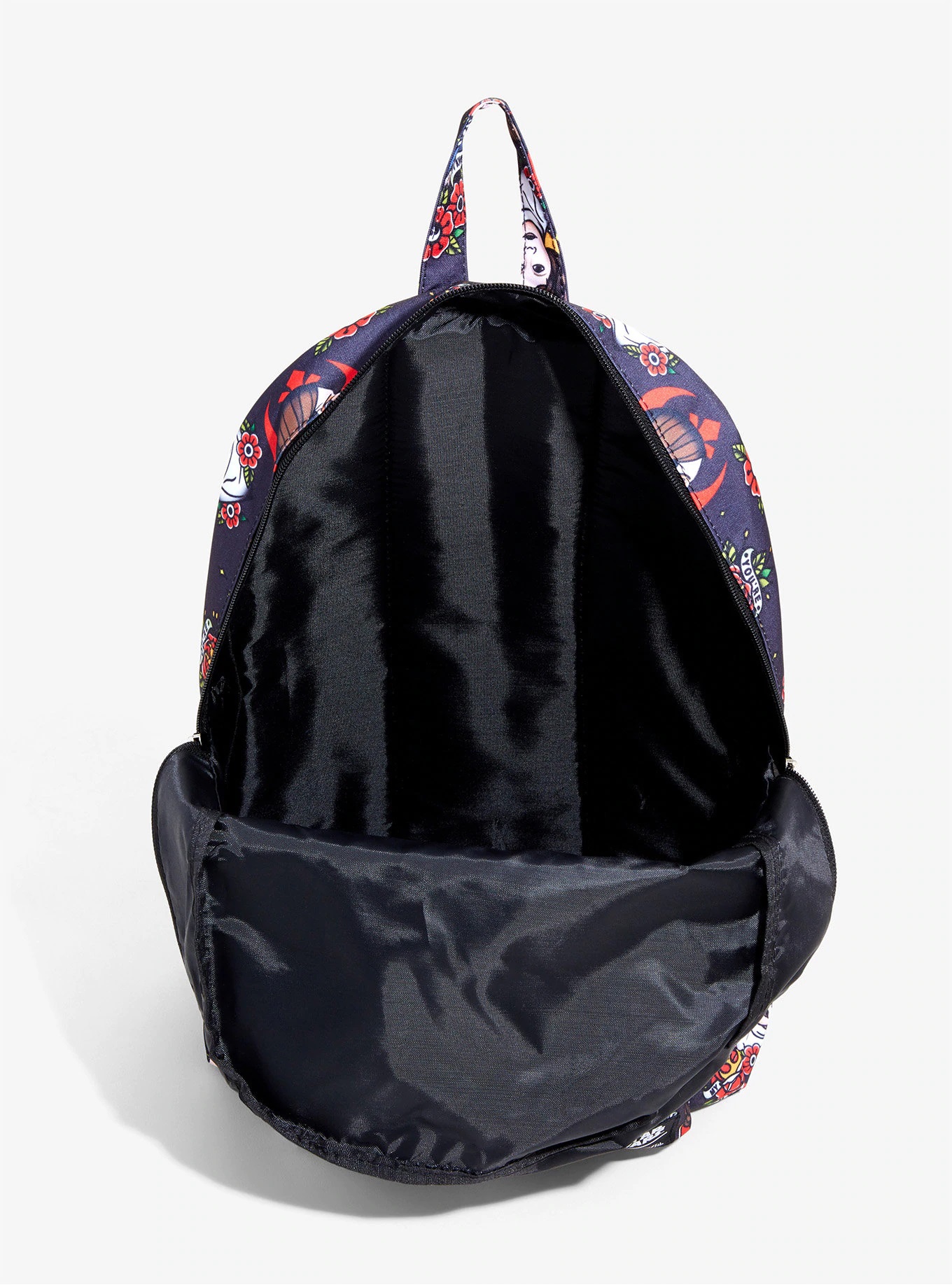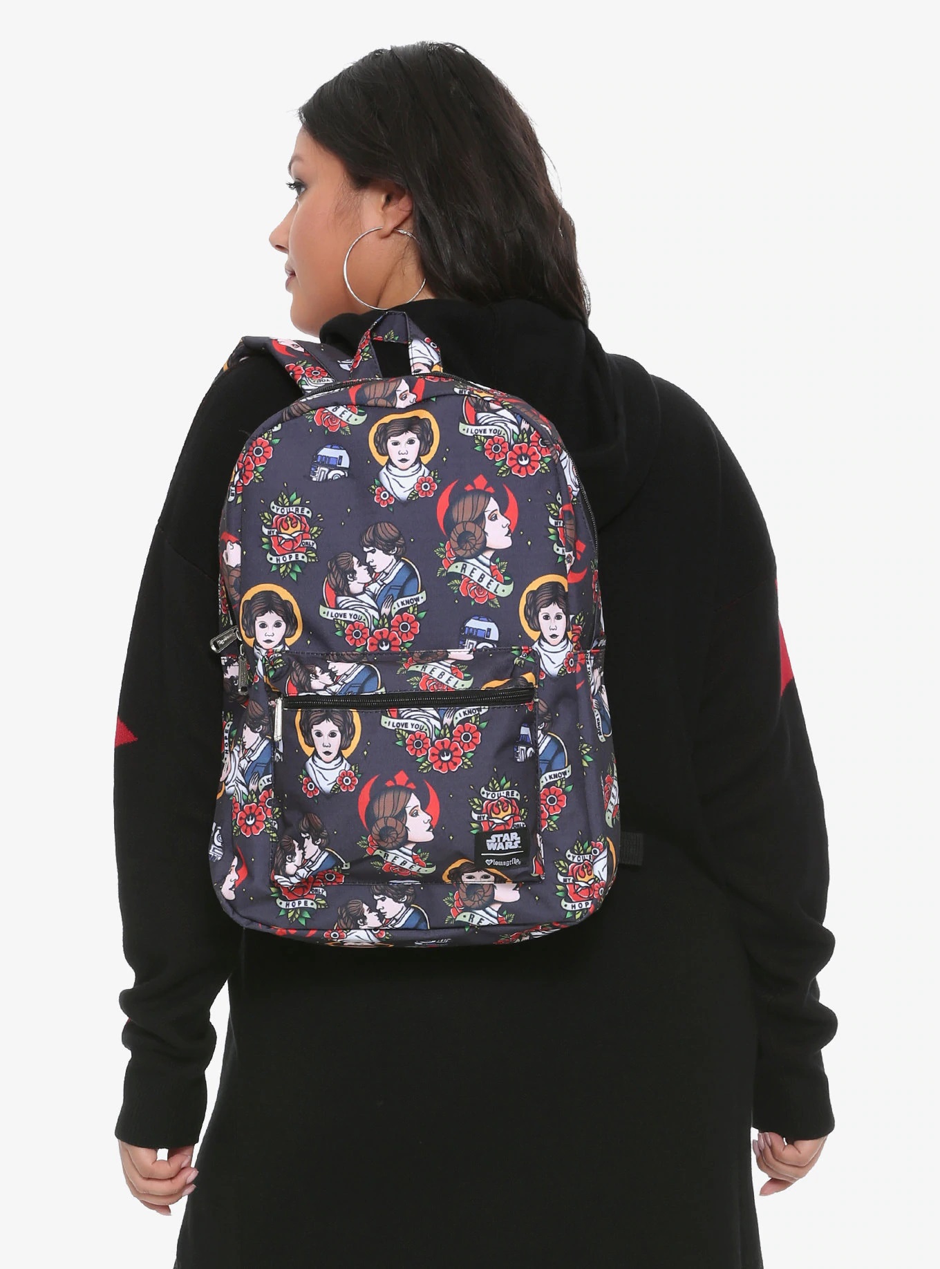 Looking for your next tattoo inspiration? Look no further than this amazing backpack from Star Wars! It features traditional style tattoo designs of Leia, Han and Artoo! The black backpack features a front zipper pocket and padded straps.