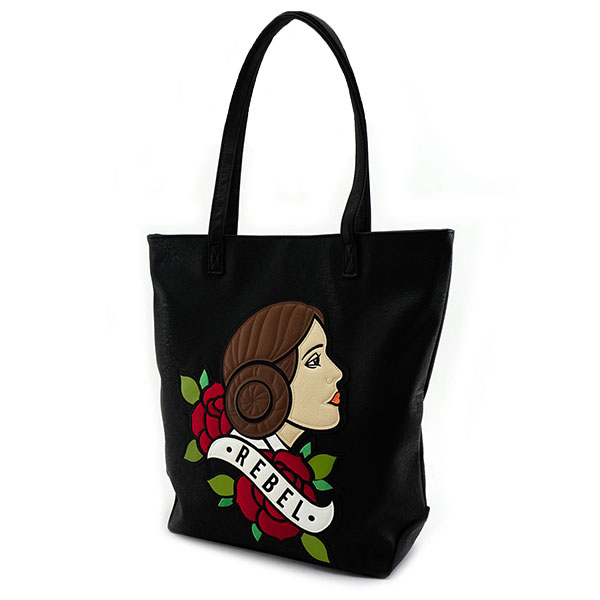 Join the rebellion! And celebrate this classic Rebel with a black tote purse featuring applique flash tattoo-style artwork of her face in profile with roses and and the banner “Rebel.” There’s lots of room inside to carry everything that a member of the Rebel Alliance needs, with a few pockets in there to keep it all organized. Need to fly casual, under the radar? The back is plain black with just a little Star Wars name plate, so flip it around to that side when you pass any Stormtrooper checkpoints.