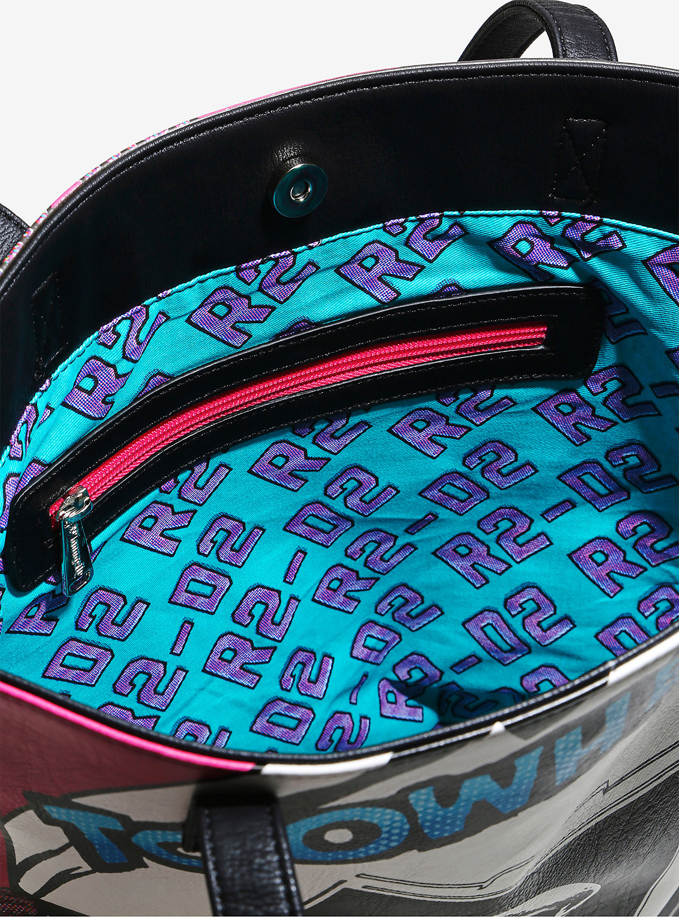 Box Lunch has a new Loungefly x Star Wars tote bag available. First previewed at the WWDMagic trade show back in February, the new R2-D2 comic tote features classic Marvel era comic book artwork on both sides, in fabulous bright colours. Inside there is a zip-up pocket (with pink zip), while the bag interior is lined with blue fabric with a repeating purple ‘R2-D2’ text design.