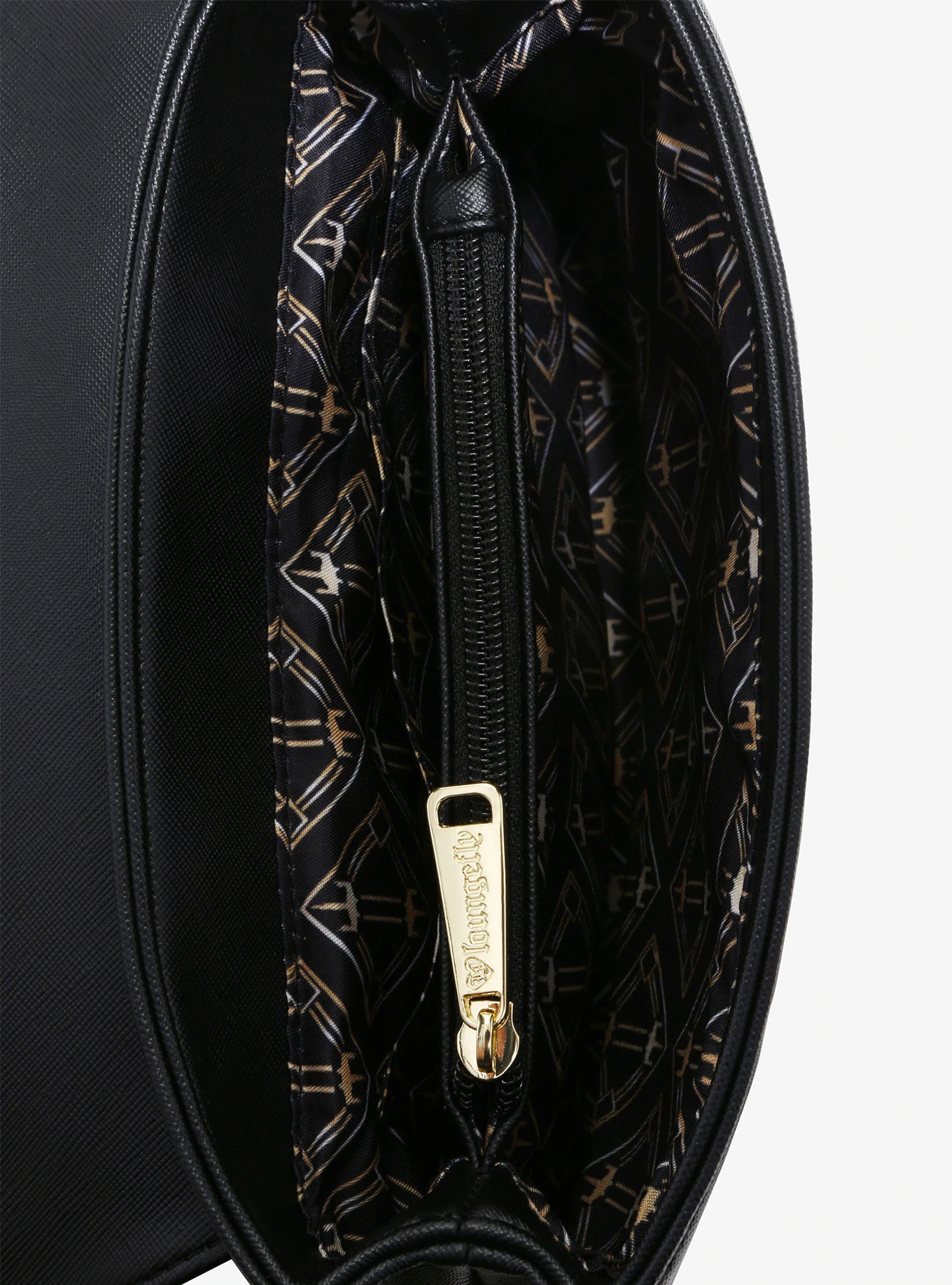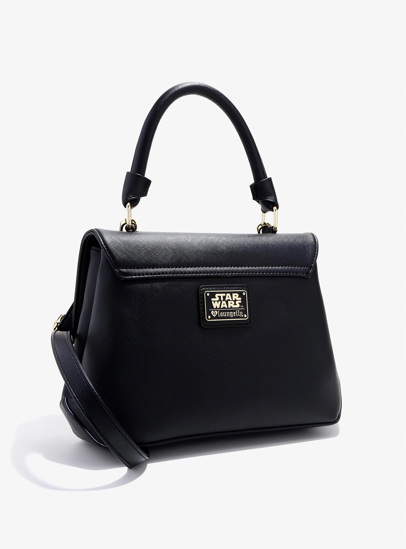 Rule the galaxy. And rule it in style. This black crossbody handbag from Loungefly and Star Wars has a golden verbiage plaque on the flap, interior ship printed lining, interior center zip pocket, and a removable strap.