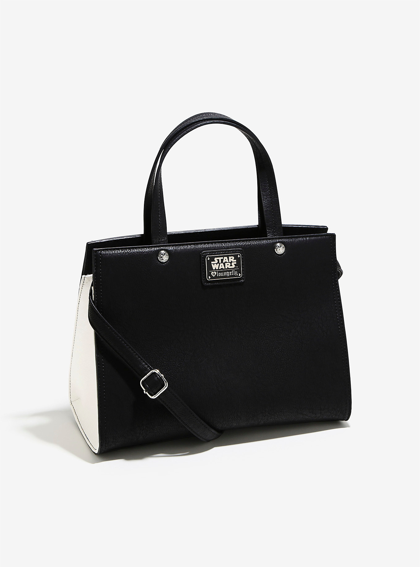 This stunning new Loungefly x Star Wars Stormtrooper applique purse and matching wallet are now available from Box Lunch! The black faux leather handbag features a black and white faux leather applique of a Stormtrooper helmet on the front, contrasting white faux leather side panels, carry handles and adjustable shoulder strap – and fantastic silver-tone Imperial symbol rivet studs!