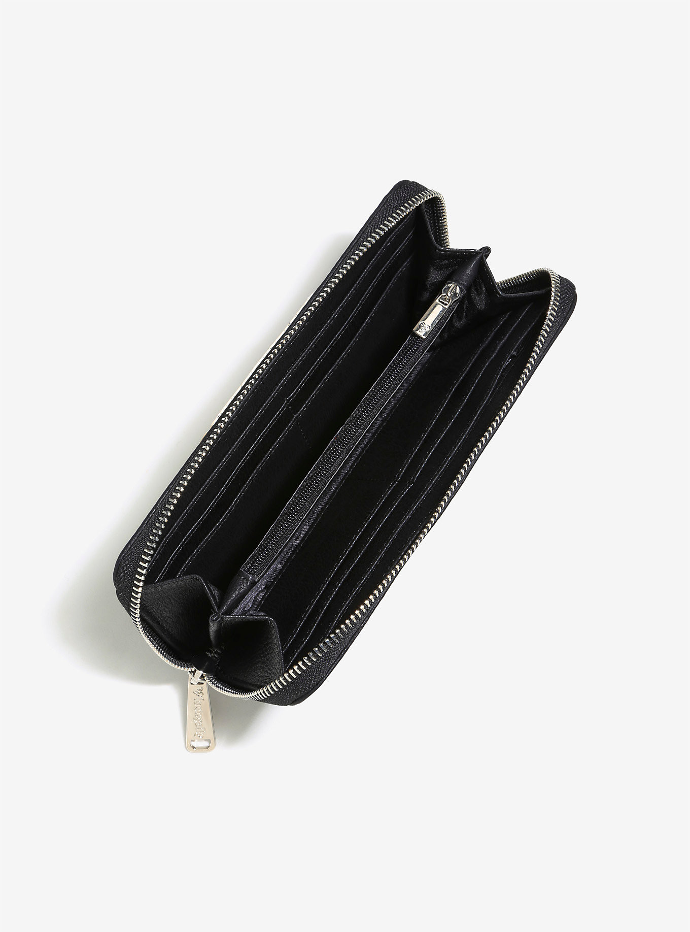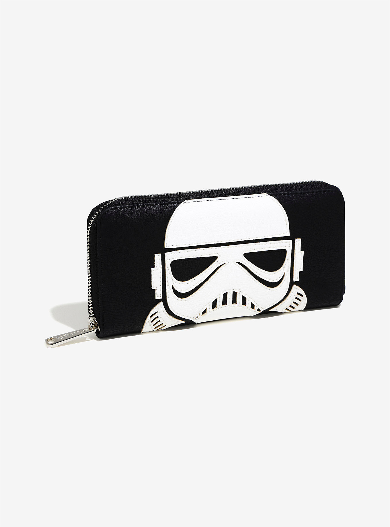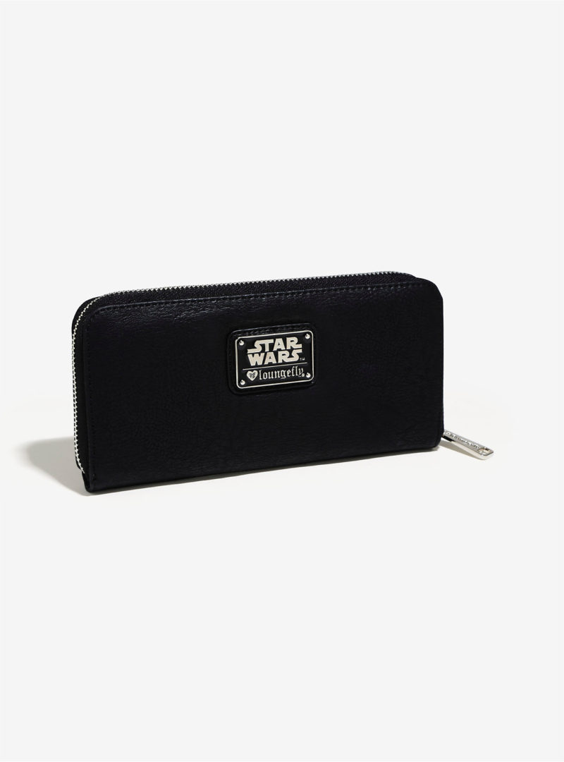 The matching wallet is a women’s zip-up style wallet, made from black faux leather with a white faux leather applique of a Stormtrooper helmet on the front.