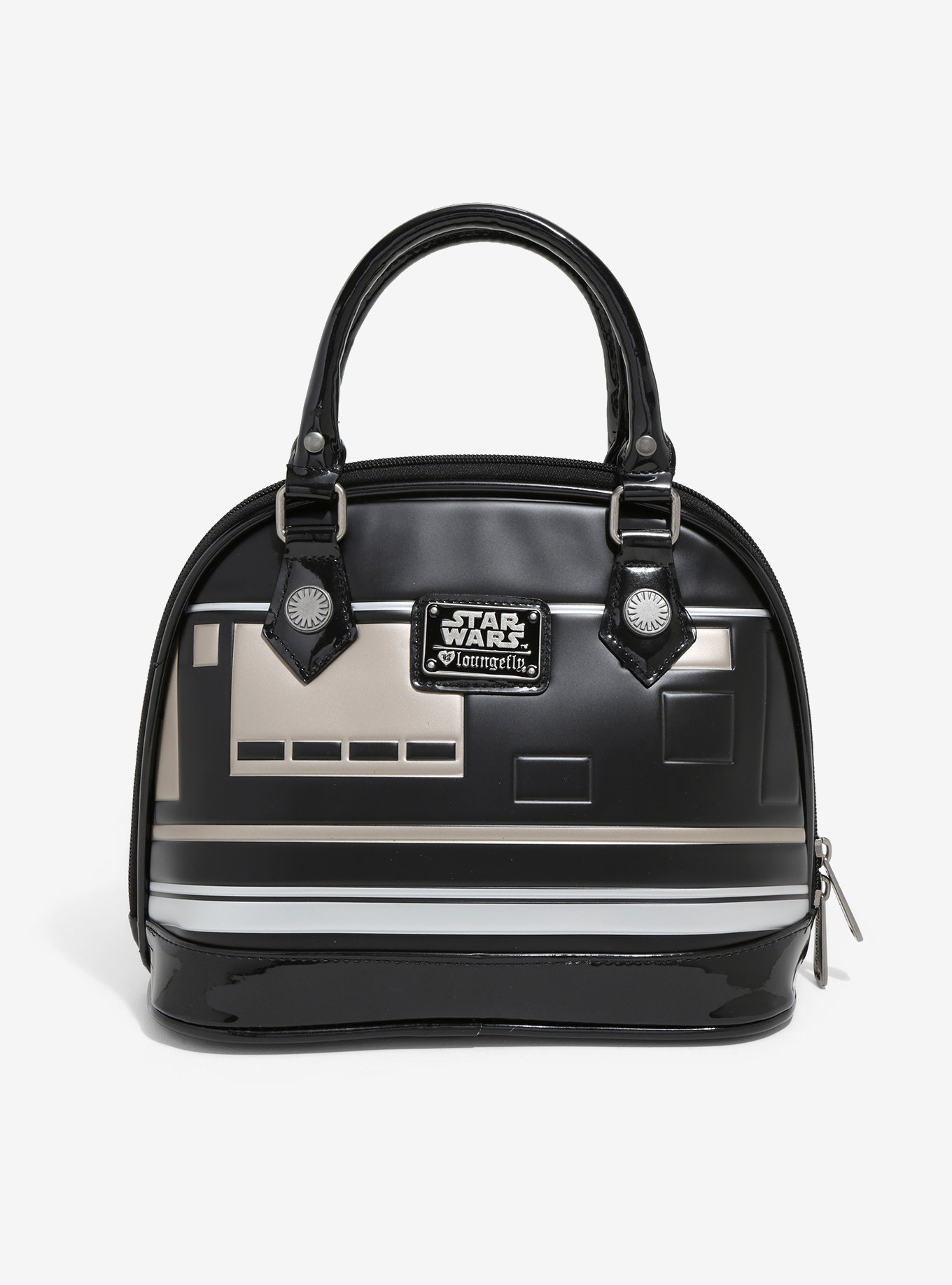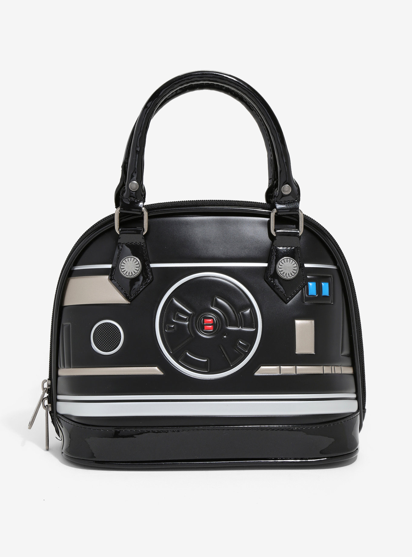 Take a roll on the Dark Side. This bag from Star Wars and Loungefly is designed after BB-9E, the black-plated BB-series astromech droid in the service of the First Order. It features a patent shine and textured construction that make this handbag one awesome accessory.