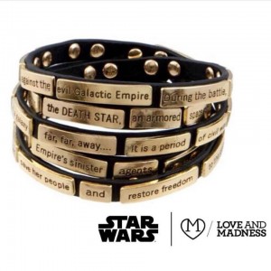 New York-based company Love And Madness has a fantastic Star Wars ‘opening crawl’ wrap bracelet available for pre-order. The black leather wrap bracelet measures approximately 3 feet long, and features every word of the opening crawl text from A New Hope. The bracelet is priced at US$50.00 each – these are scheduled to ship on April 15th. Unfortunately Love And Madness only have ‘United States’ and ‘United Kingdom’ as available shipping destinations, so international customers can only purchase via a mail redirection service.