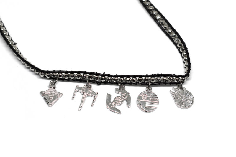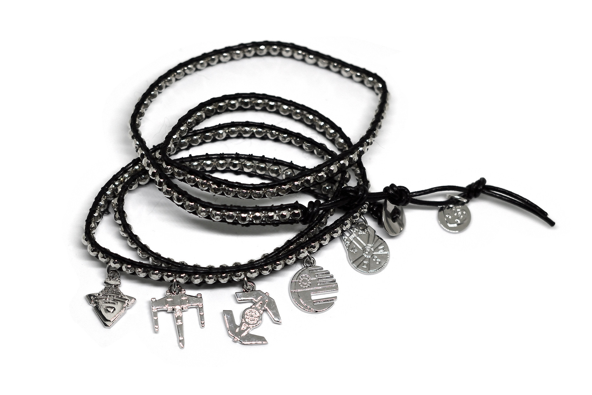 Love And Madness have a new Star Wars wrap bracelet available! First previewed back in November, the ‘Ships Happen’ wrap bracelet features 5 dangle charms of Star Wars starships including Star Destroyer, X-Wing Fighter, TIE Fighter, Death Star, and Millennium Falcon. The bracelet itself is made from 2 long black leather cords with silver tone beads threaded between.