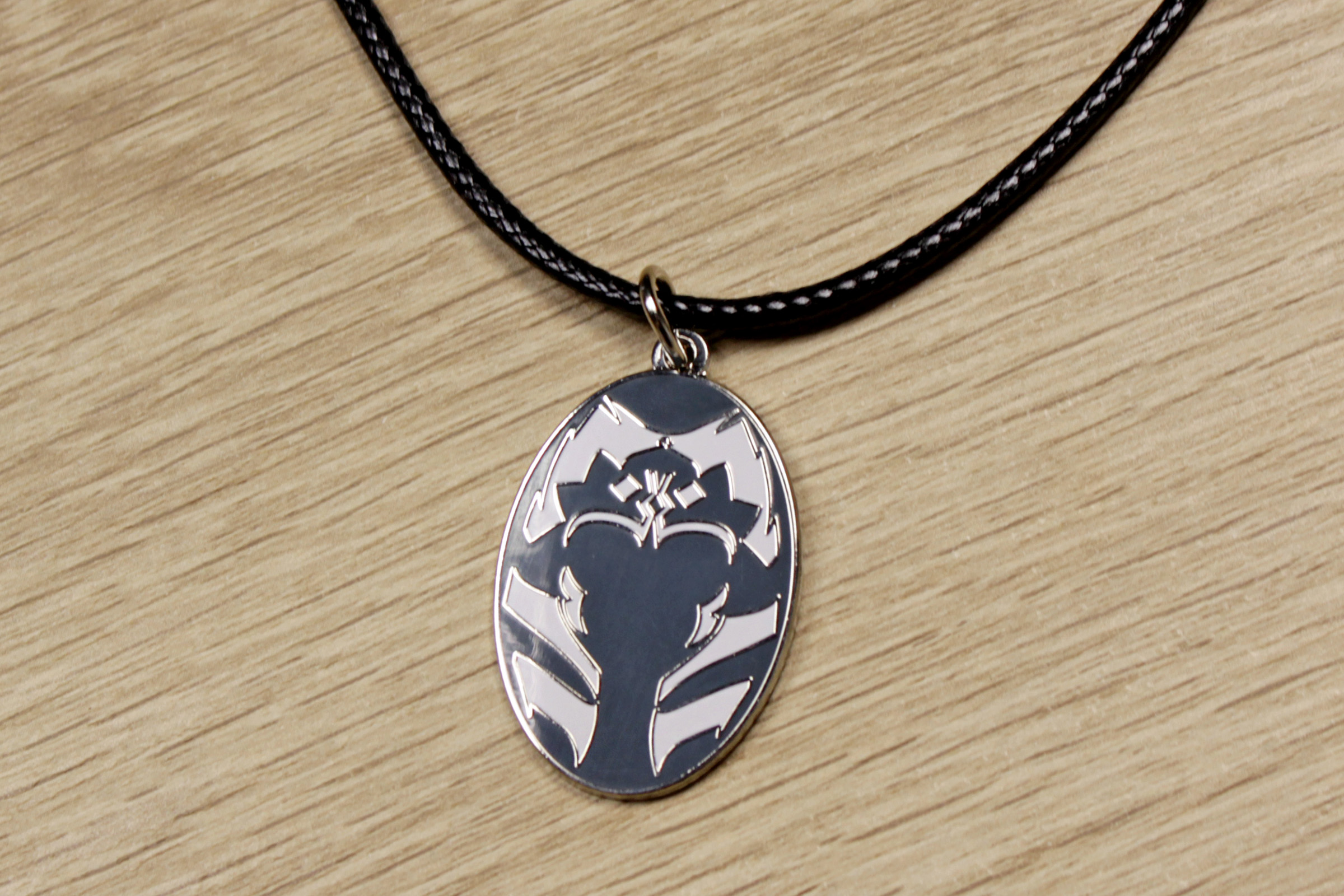 This necklace features a silver-toned oval pendant, with inlaid white and grey-blue enamel. The enamel details are clean and crisp, even up close. The pendant has a good balance of enough detail to be recognised as Ahsoka Tano themed, without it getting cluttered or messy.