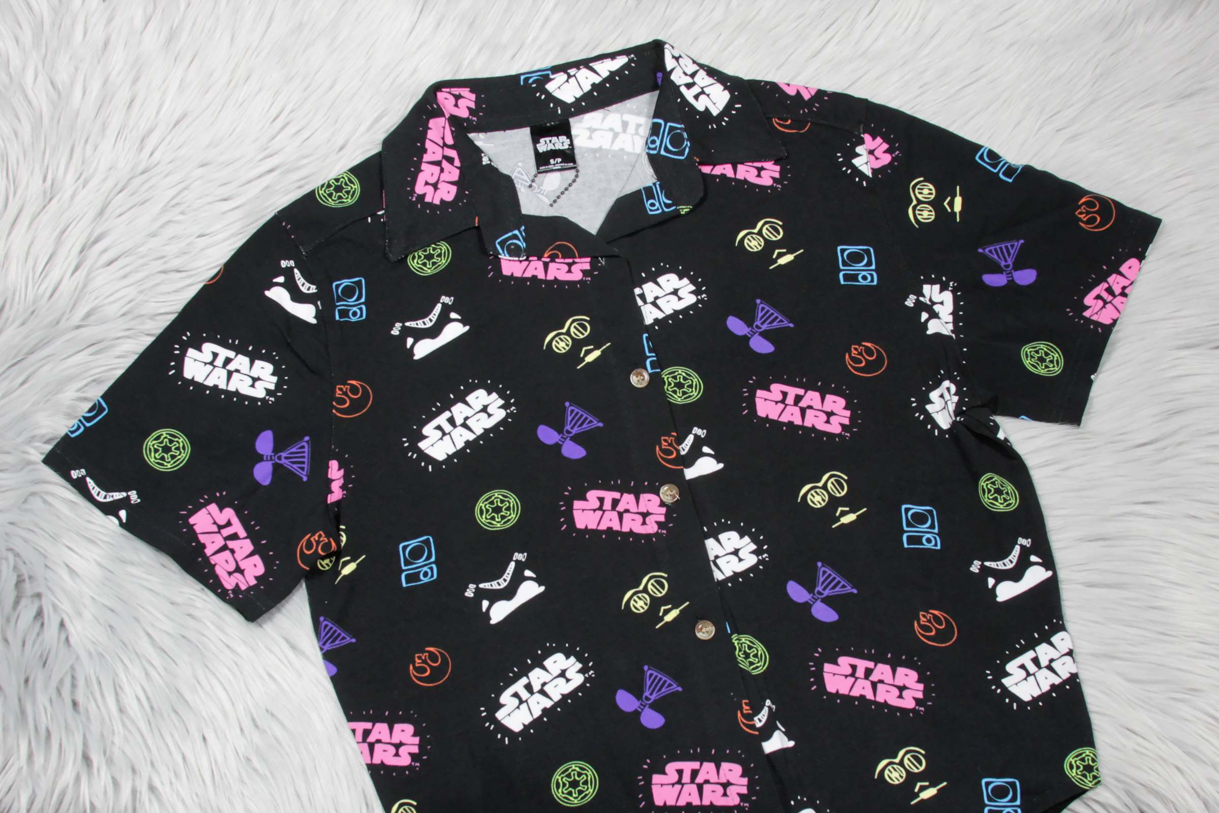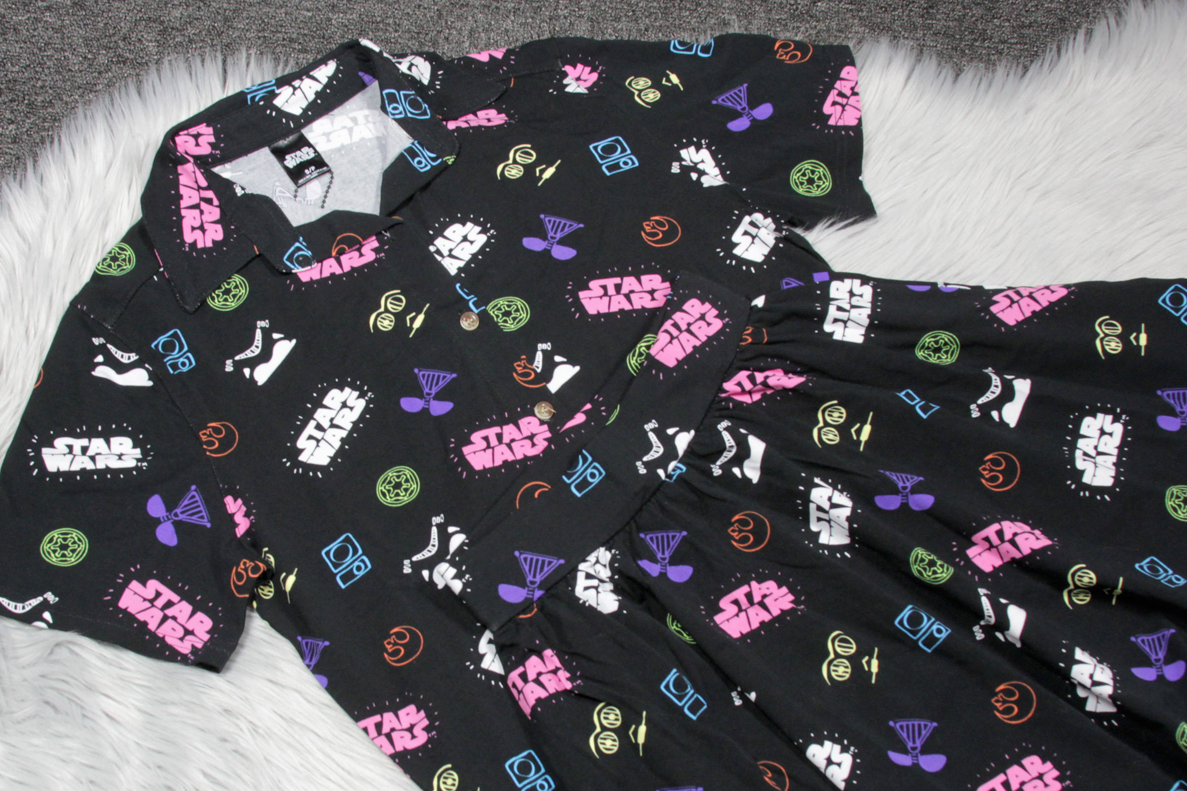 This 80’s inspired shirt and skirt wasn’t sold as a set, but I of course bought both together. Vibrant and fun Star Wars fashion will always grab my attention, and I’m never shy about wearing loud Star Wars prints and patterns – I especially love the use of pink and purple in this design.