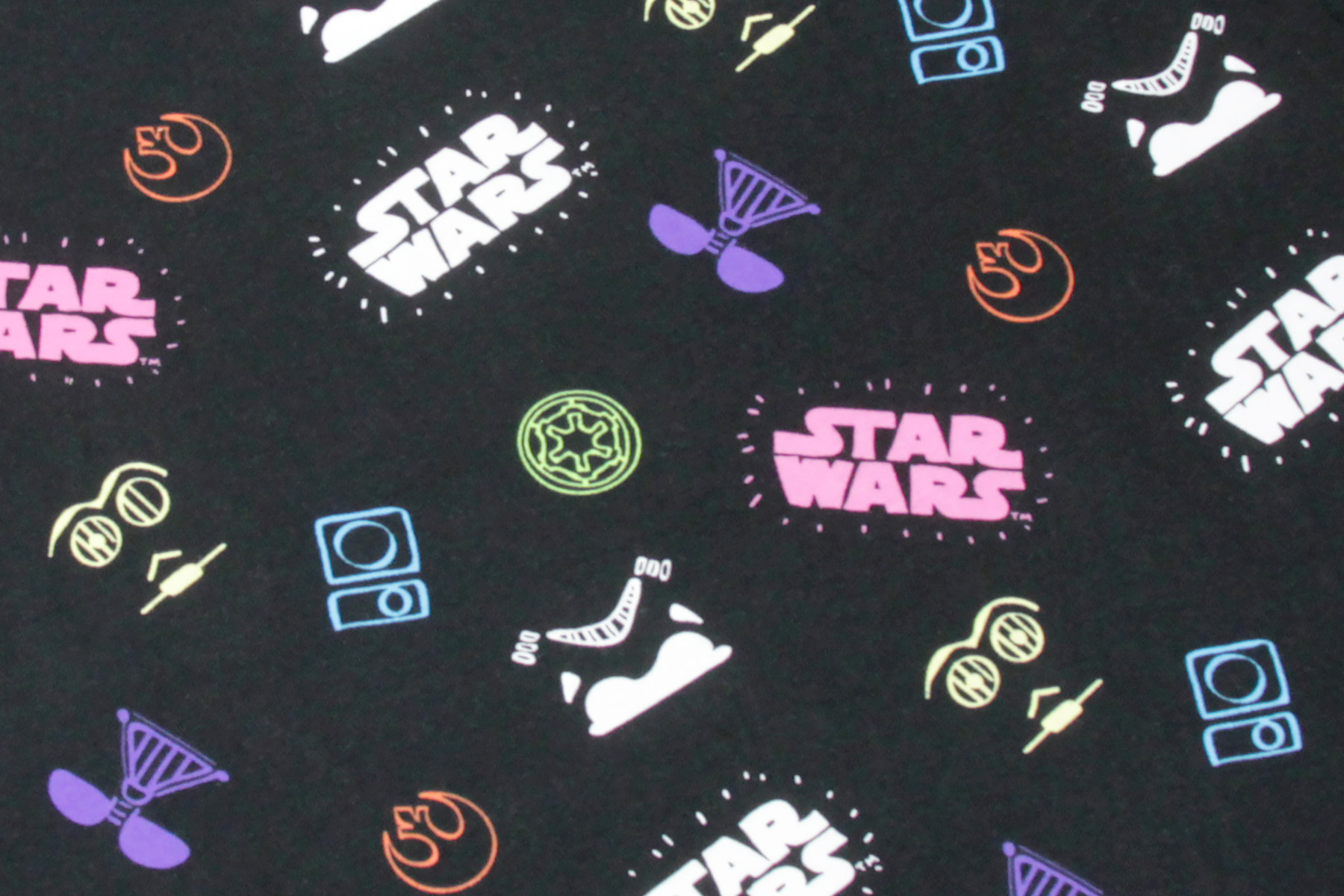 The print is obviously the star of this set. The vibrant coloured pattern features the Star Wars logo in both pink and white, the Imperial symbol in green, the Rebel symbol in orange. There are also four Star Wars character ‘faces’ – well, not actual faces, but that’s the best way I can think to describe it. We have Darth Vader in purple, Stormtrooper in white, C-3PO in yellow, and R2-D2 in blue. The ‘faces’ are a little abstract, in that they don’t have borders to define the shape – I almost didn’t recognise the R2-D2 print, when you reduce his dome down to his ‘eyes’ he looks like a Polaroid camera!