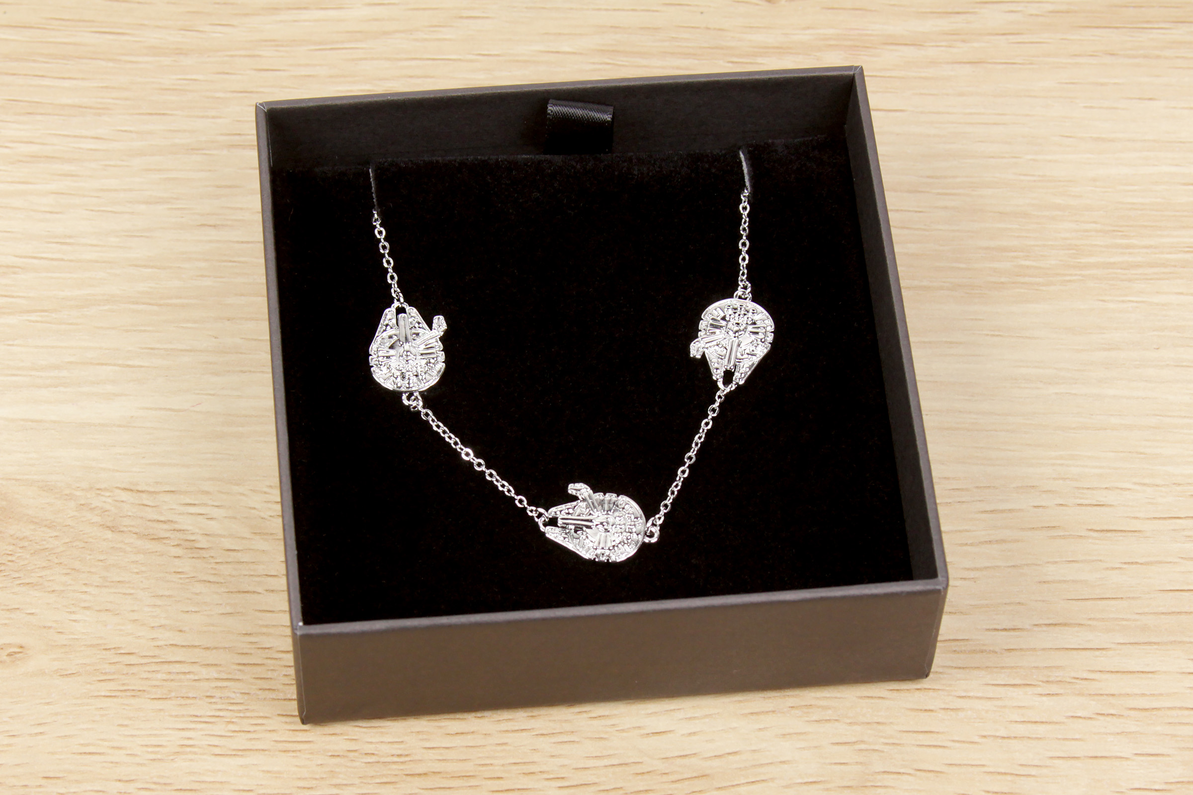 The matching Millennium Falcon necklace is also 14k white gold plated, and it shows. It really shines under lights just like the earrings. I was really drawn to the three-pendant design, with the ships in line with the necklace chain. The back of each pendant is flat, so it sits comfortably against the skin when wearing. The chain is adjustable, with three different length settings so you can choose the length you prefer.