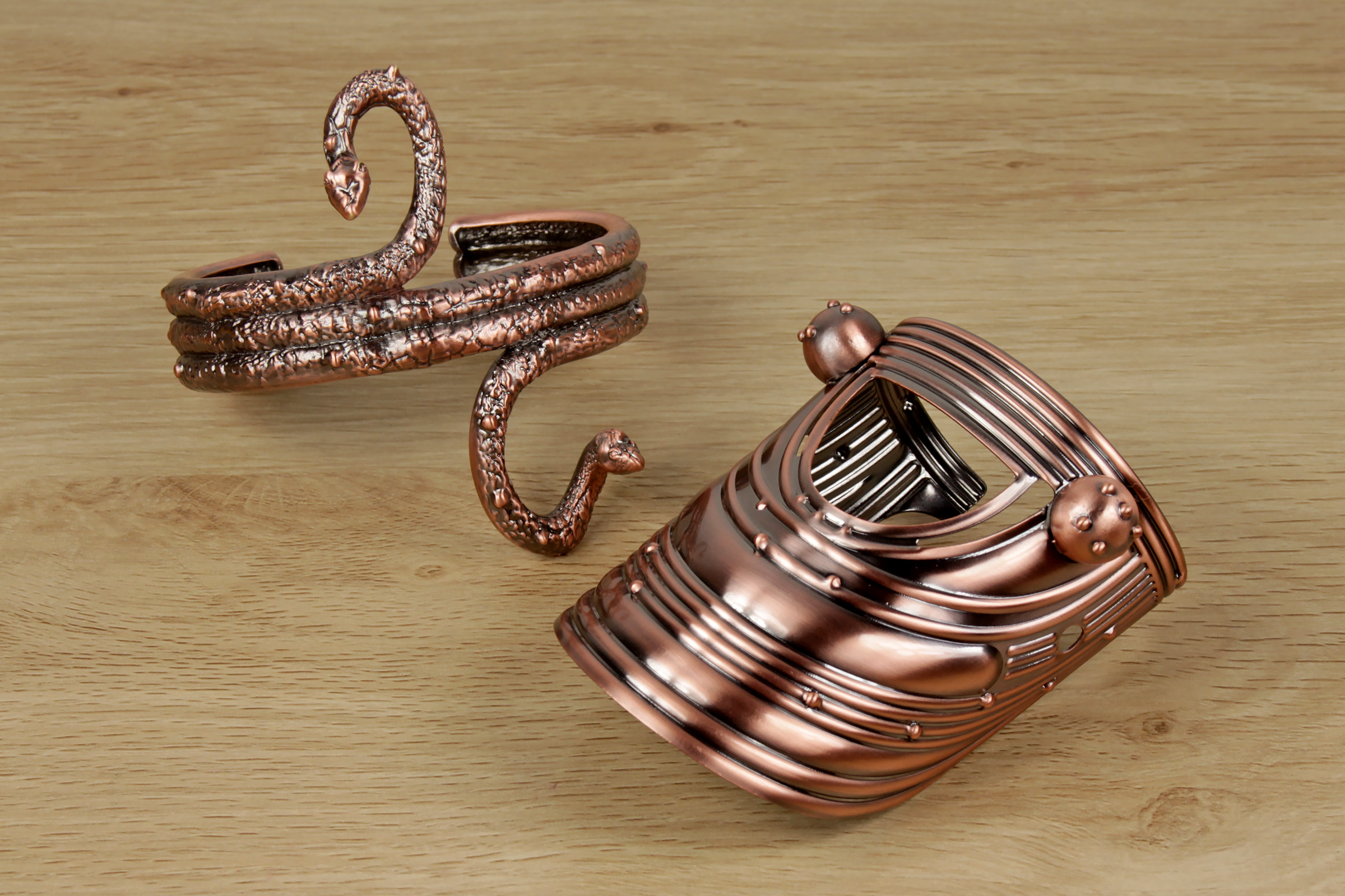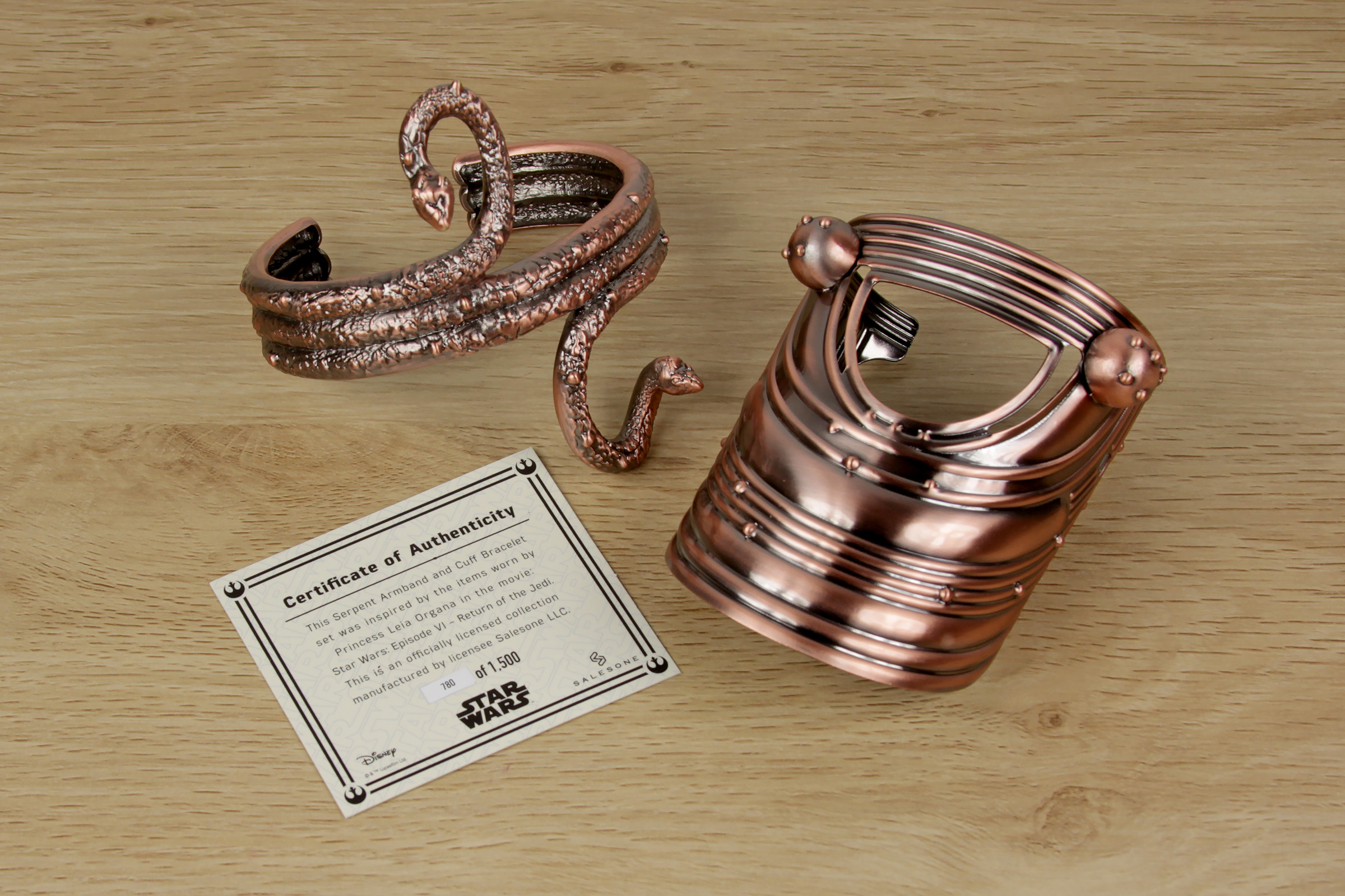 The set is a limited edition of 1,500 pieces, each with a numbered certificate of authenticity. The set includes a bracelet and armband, replicas from the metal bikini outfit Princess Leia wears in Jabba’s palace in Return Of The Jedi. The jewelry comes in a black display box, with the edition number on the top, and a neat hyperspace print inside the lid.