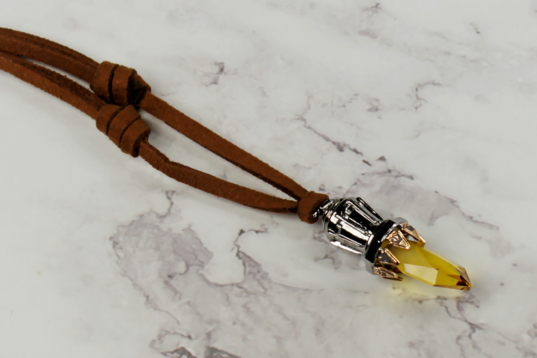 If I was going to dive in and try one on, so to speak, it was going to be the Rey necklace. Sure, I wasn’t the biggest fan of the leather cord, but I just love Rey’s lightsaber, and the beautiful yellow crystal had been singing out to me for a while. When the Ahsoka Tano jewelry launched, I decided to grab it and save on combined international postage – and I’m very glad I did.