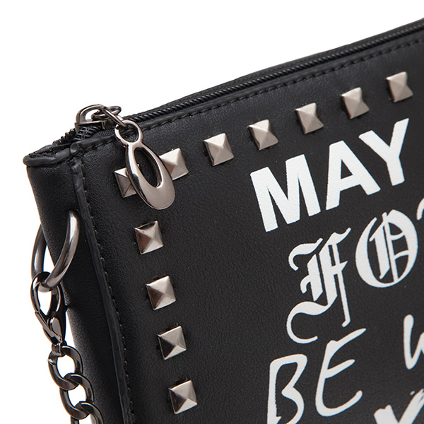 This awesome new Star Wars crossbody bag is now available at ThinkGeek. The black faux leather handbag features the classic Star Wars quote ‘May The Force Be With You’ printed on the front in white lettering. The mix of different fonts, combined with the metal studs give the bag a fun punk vibe, not often seen in Star Wars handbags.