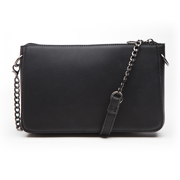 The bag features a removable crossbody strap with chain-link details, which attaches to the purse using oversized lobster clasps. There is a top zip closure, and the interior also has a zipper pocket for smaller accessories. Whether your never-leave-home-without-it essentials include phones, wallets, or lightsabers, this bag will come in handier than a droid co-pilot during a Death Star raid!