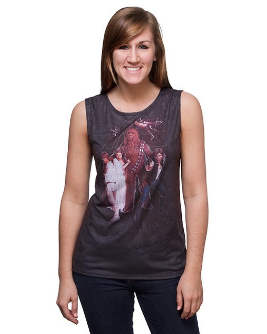 Following on from their recent additions, Thinkgeek has another two new women’s Star Wars tank tops available. The first is a yellow tank top that features a front print of Chewbacca, with the text ‘Speak Wookiee To Me’. The second new tank top at Thinkgeek appears to be from the recent Her Universe collection of tops, though the Thinkgeek website doesn’t mention it. The muscle cut tank top features a front ‘vintage poster’ style print of the main Star Wars hero group – Luke Skywalker, Princess Leia, Chewbacca, and Han Solo. Both tank tops are priced at US$24.99 each – Thinkgeek can ship internationally.
