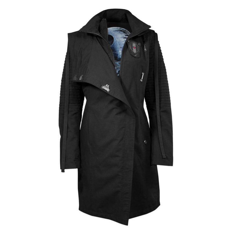 The Dark Lords of the Sith usually hide in the shadows, but when they emerge, they set great value on a menacing appearance. This limited edition longline coat by Musterbrand has interchangable badges, Death Star II lining, and an asymmetrical design.