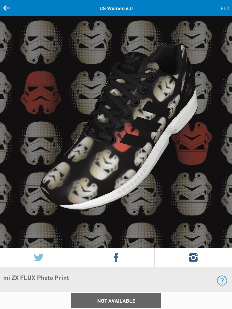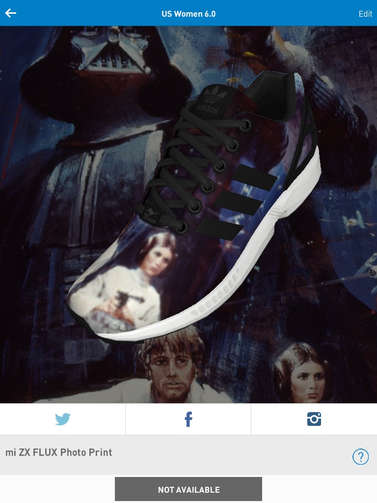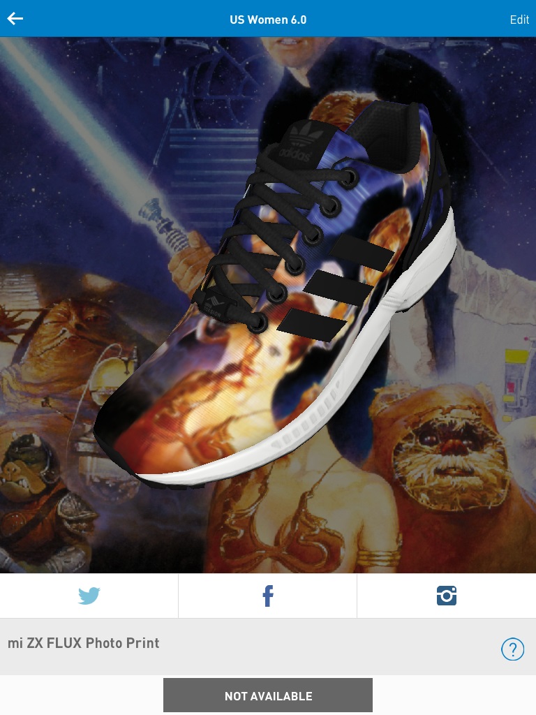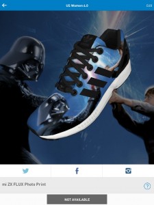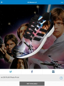 In honor of May the Fourth, Adidas has updated the mi zx flux customizable footwear app to include a huge gallery of Star Wars images! What does this mean – you can choose your shoe size, choose an image, customize your very own pair of Adidas x Star Wars shoes – and order them! I was excited when they released a teaser image a few days ago – and now they’re here! Unfortunately, as I’m in New Zealand it won’t let me proceed past the customizing phase, listing creations as ‘not yet available in my region’ (the app details include the list the countries where the product is currently available to order).